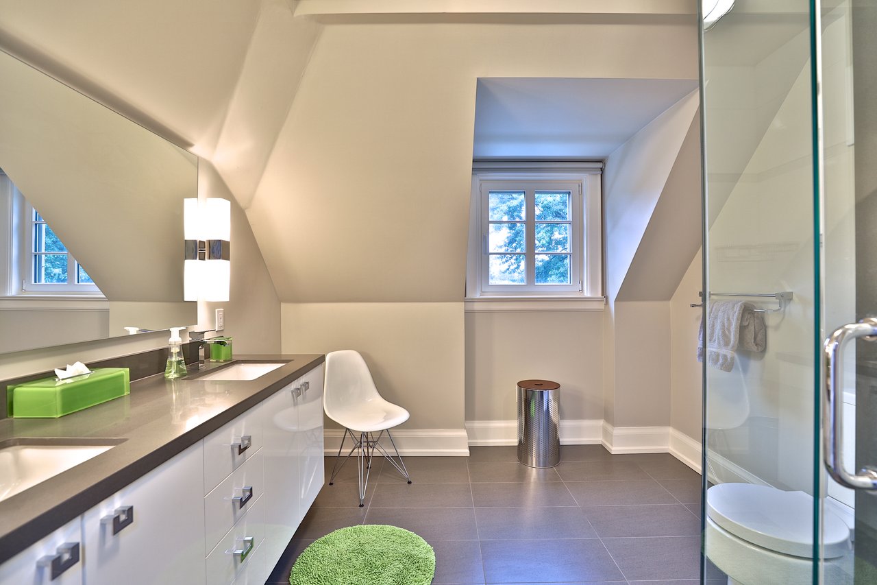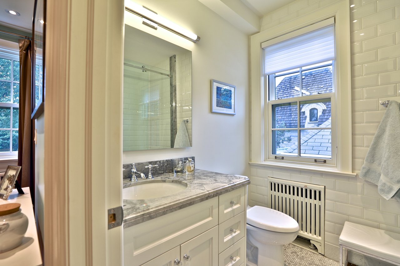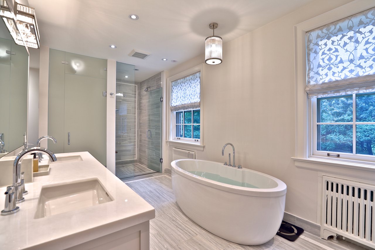 The luxurious 7-piece ensuite bath, entered through a pocket door, features a custom furniture style vanity with “His” and “Hers” under mount sinks, pot lights, windows outfitted with custom drapery overlooking the rear gardens, marble countertop, framed mirror, wall sconces, a freestanding Slik oval bathtub with designer fixtures, an expansive seamless glass shower with a fold down teak seat, linear drain, handheld faucet, stationary faucet, a frosted seamless glass water closet housing the toilet and a heated nestos gray heated marble floor with Thassos marble border.
