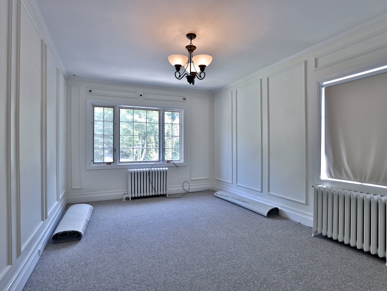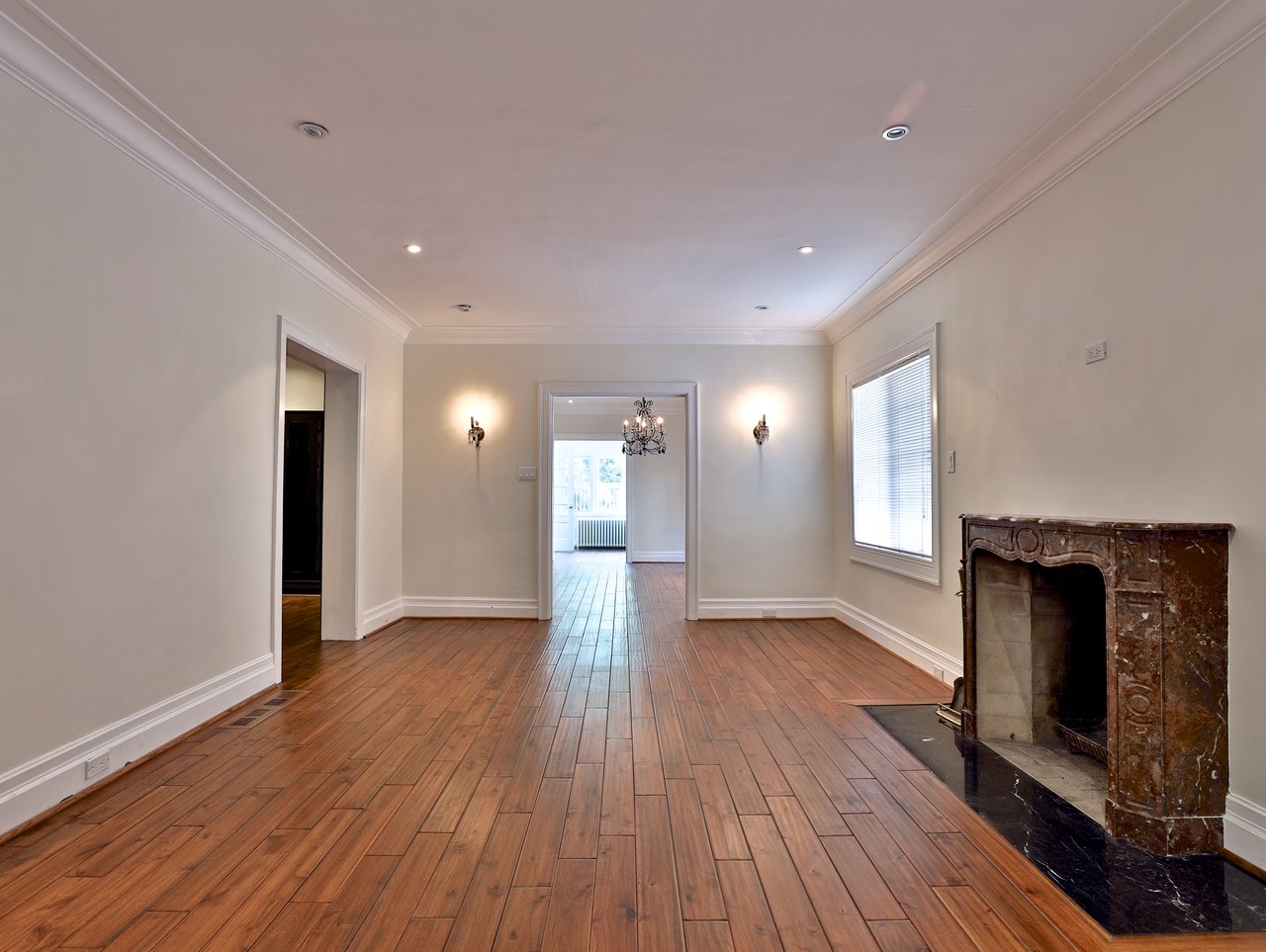 The formal and opulent Living Room features hardwood floor, an archway leading to the Dining Room, crown molding, pot lights, a window outfitted with custom blinds overlooking the front gardens, a wood burning fireplace with a carved marble mantle, light sconces and a window outfitted with custom blinds overlooking the side gardens.