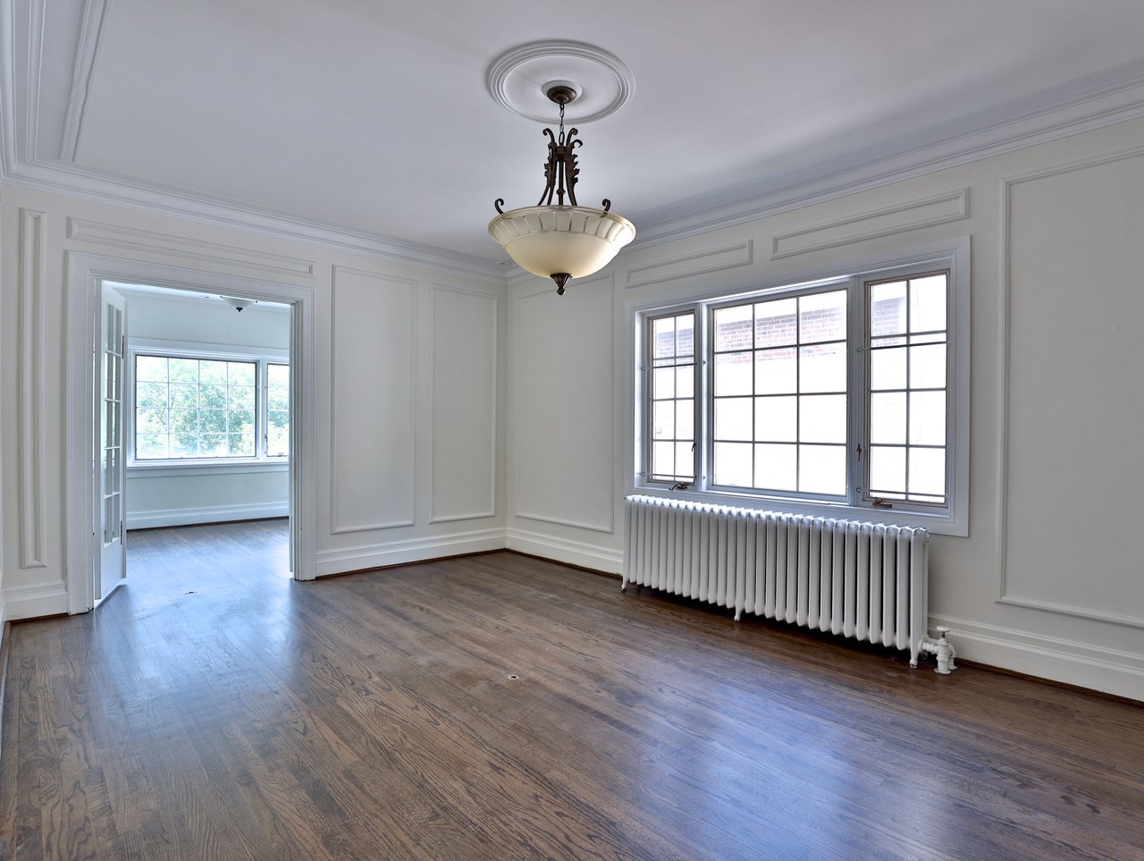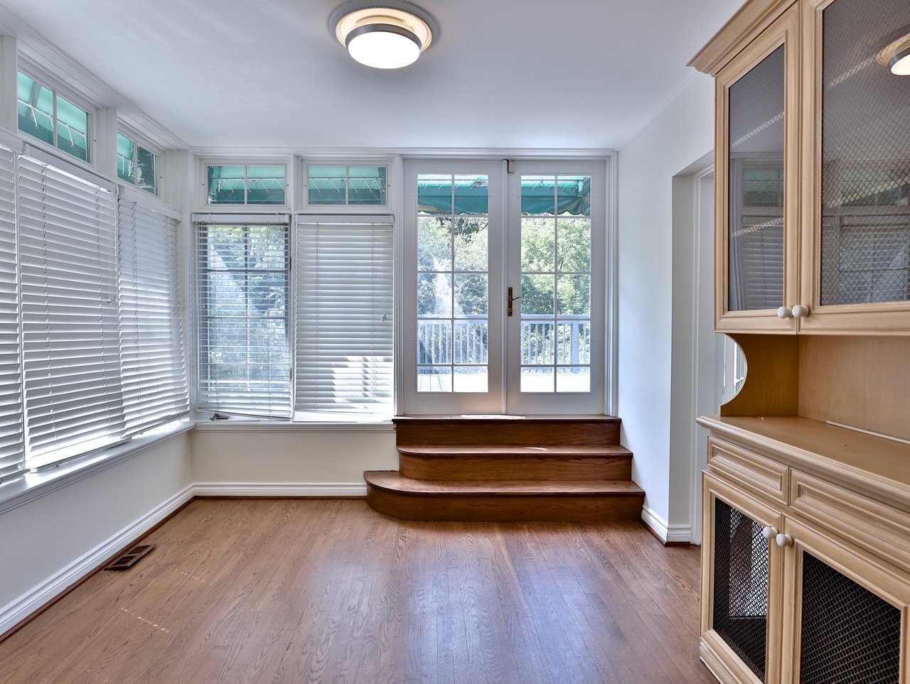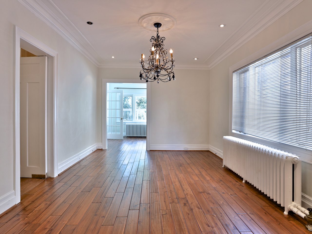The formal Dining Room features hardwood floor, an archway opening onto the Living Room, crown molding, pot lights, an archway opening onto the Sitting Room, chandelier medallion, chandelier, a window outfitted with custom blinds overlooking the side gardens and a swing door opening onto the Kitchen.