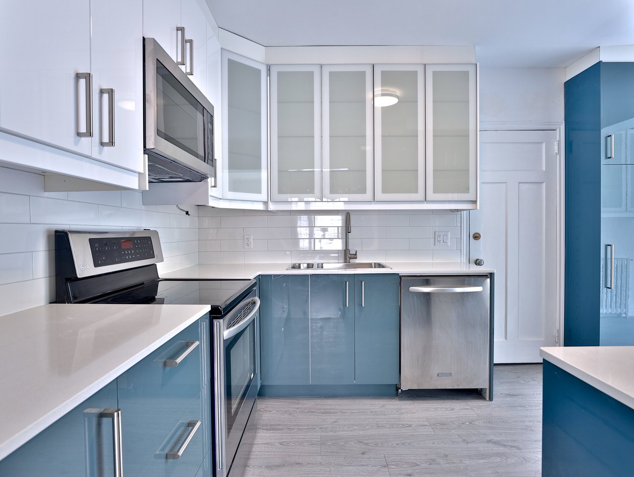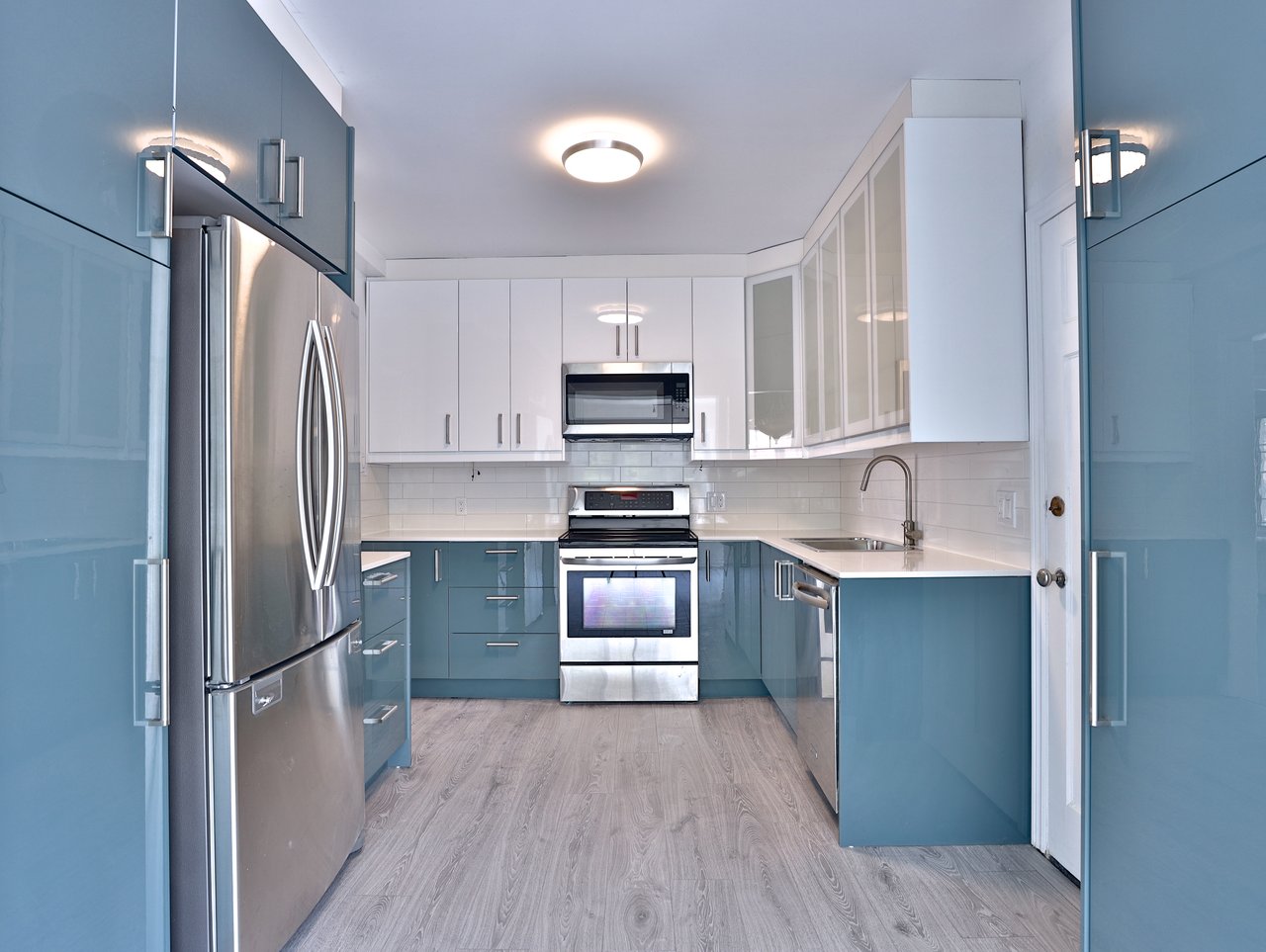The renovated Kitchen features laminate floor, a light fixture, access to the service staircase, custom cabinetry, several frosted glass front cabinets, a tile backsplash, caesarstone countertop and a dual bowl stainless steel under mount sink with a retractable faucet.