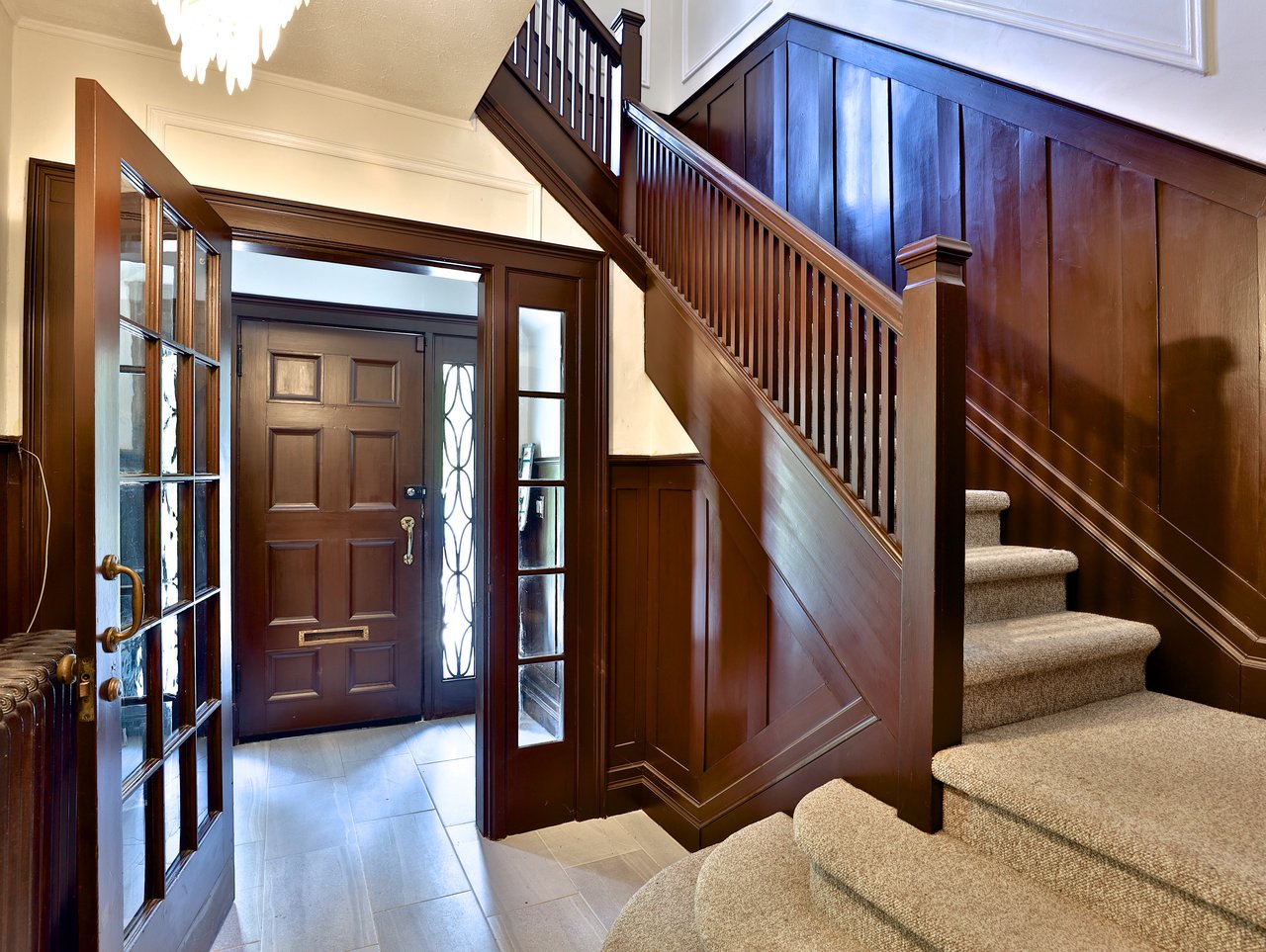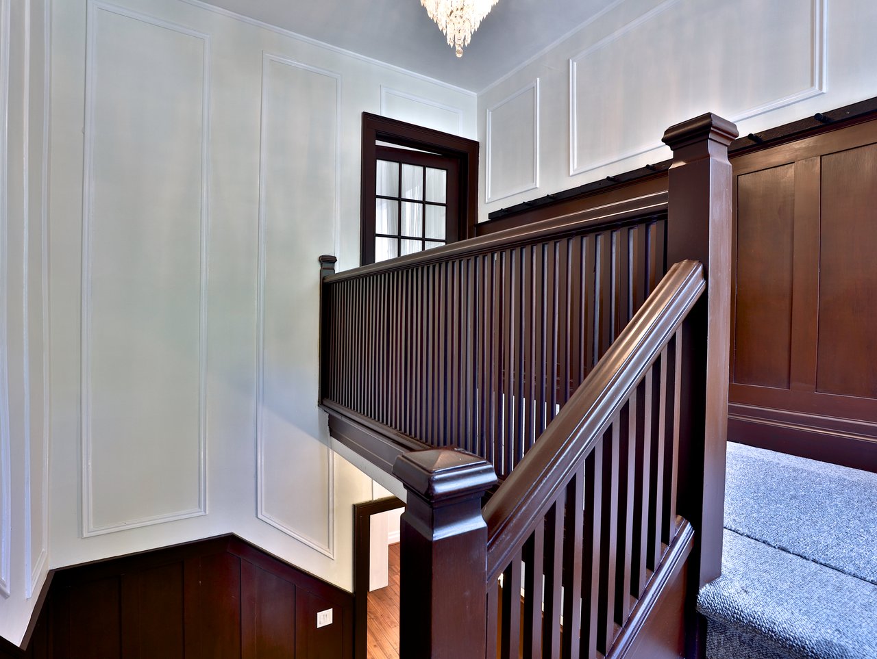 The Main Hall features tile floor, chandelier, floor-to-ceiling paneled walls and a grand offside wood staircase leading to the Upper Level Unit.