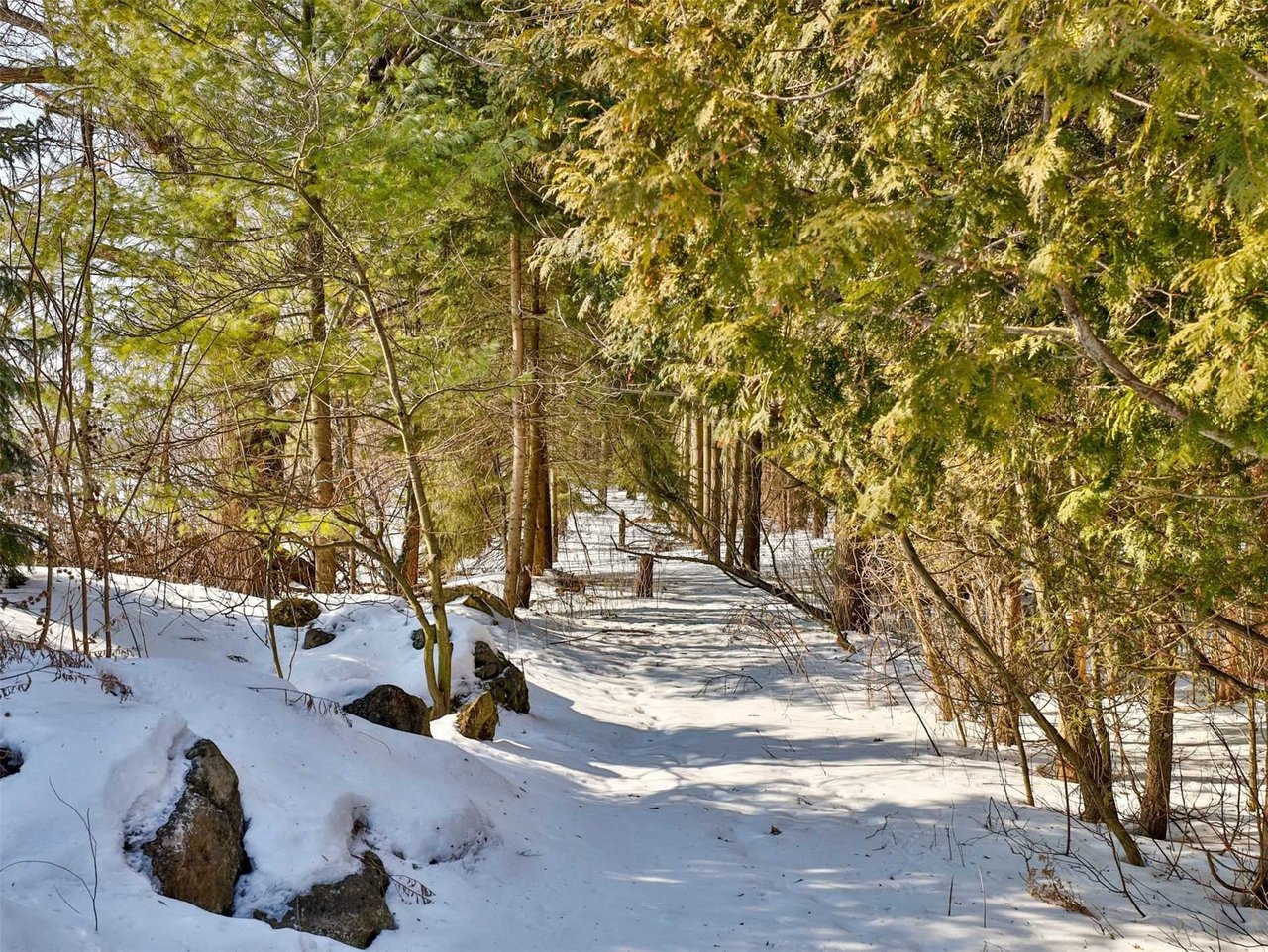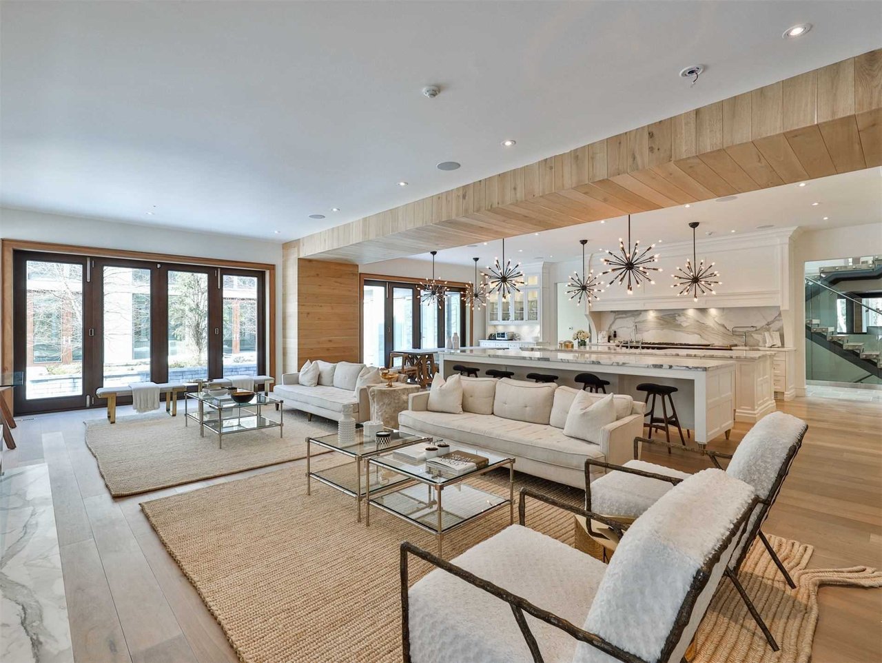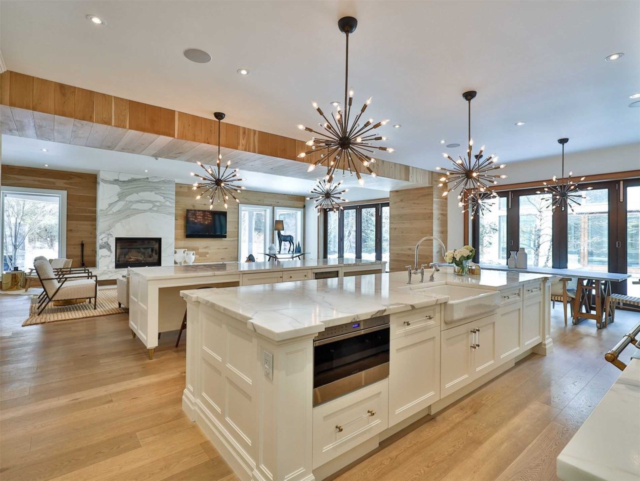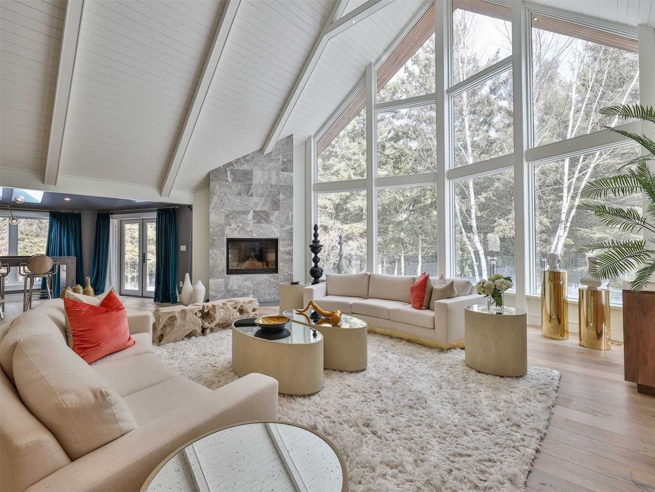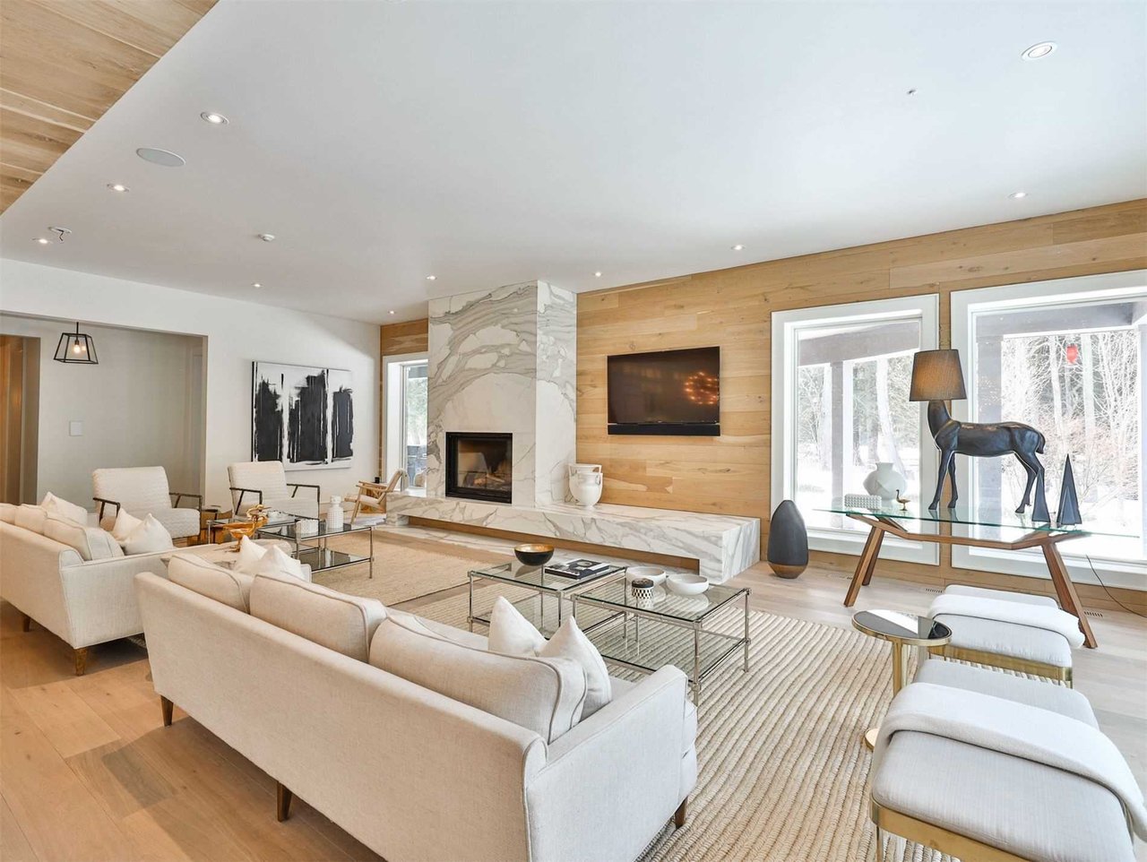 The sprawling Living Room, open in design to the Sitting Room, features soaring vaulted beamed wood paneled ceiling, pot lights, floor-to-ceiling windows overlooking the side gardens and deck and a most impressive wood burning fireplace complete with a floor-to-ceiling marble mantle.