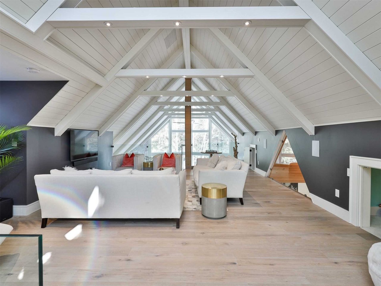 The Loft, overlooking the Living Room, features hardwood floor, pot lights, windows, two closets/ play nooks and a vaulted beamed and paneled ceiling.