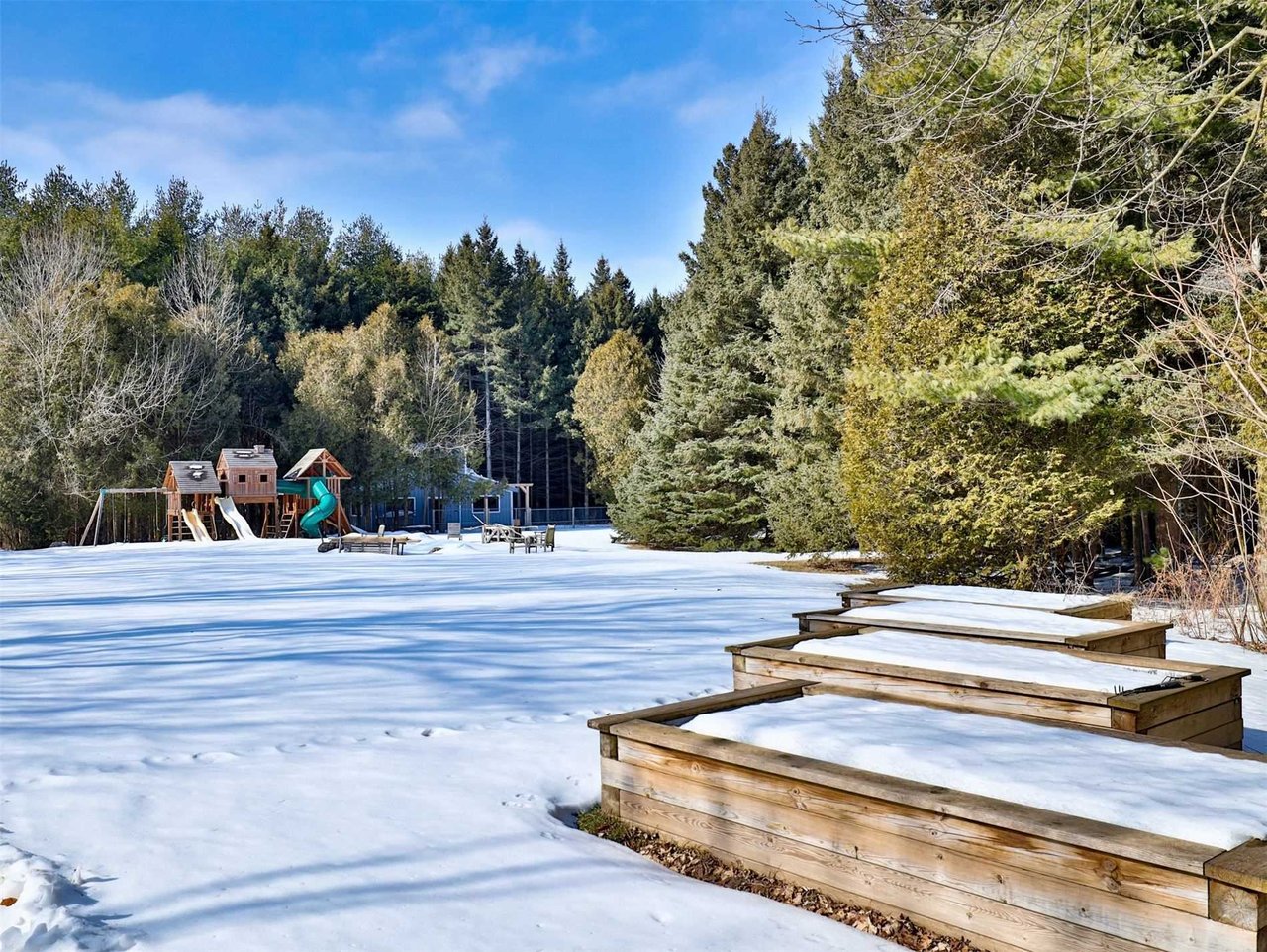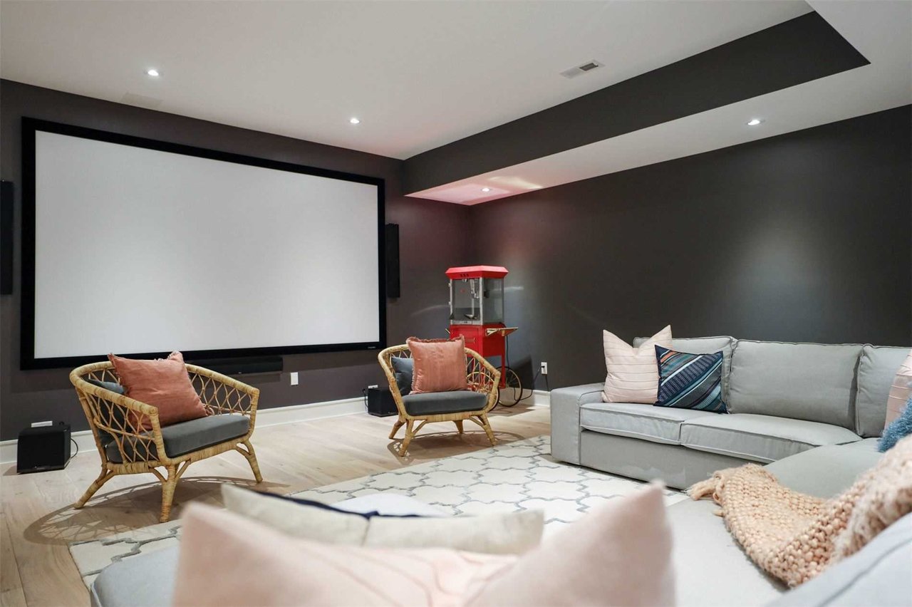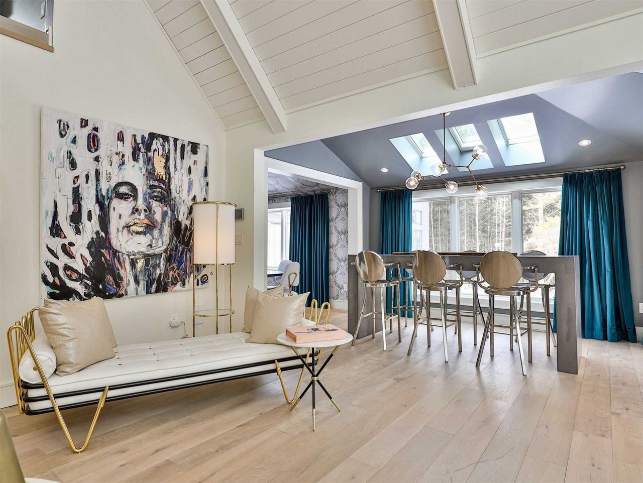 The Bar Area, open in design to the Living Room and conveniently located adjacent to the Dining Room, features a light fixture, skylights, a walk-out to the wrap around deck, pot lights, built-in speakers, vaulted ceiling and an array of windows outfitted with custom drapery overlooking the rear gardens.