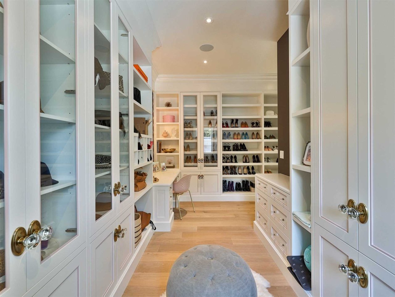 The expansive Dressing Room features pot lights, a skylight, built-in speakers, crown molding, floor-to-ceiling custom cabinetry, open display shelving, several glass front display cabinets, pull out drawers, an expansive glass top center island, ample storage, shoe shelving, purse shelving a window overlooking the gardens and a makeup vanity complete with tufted velvet accents.