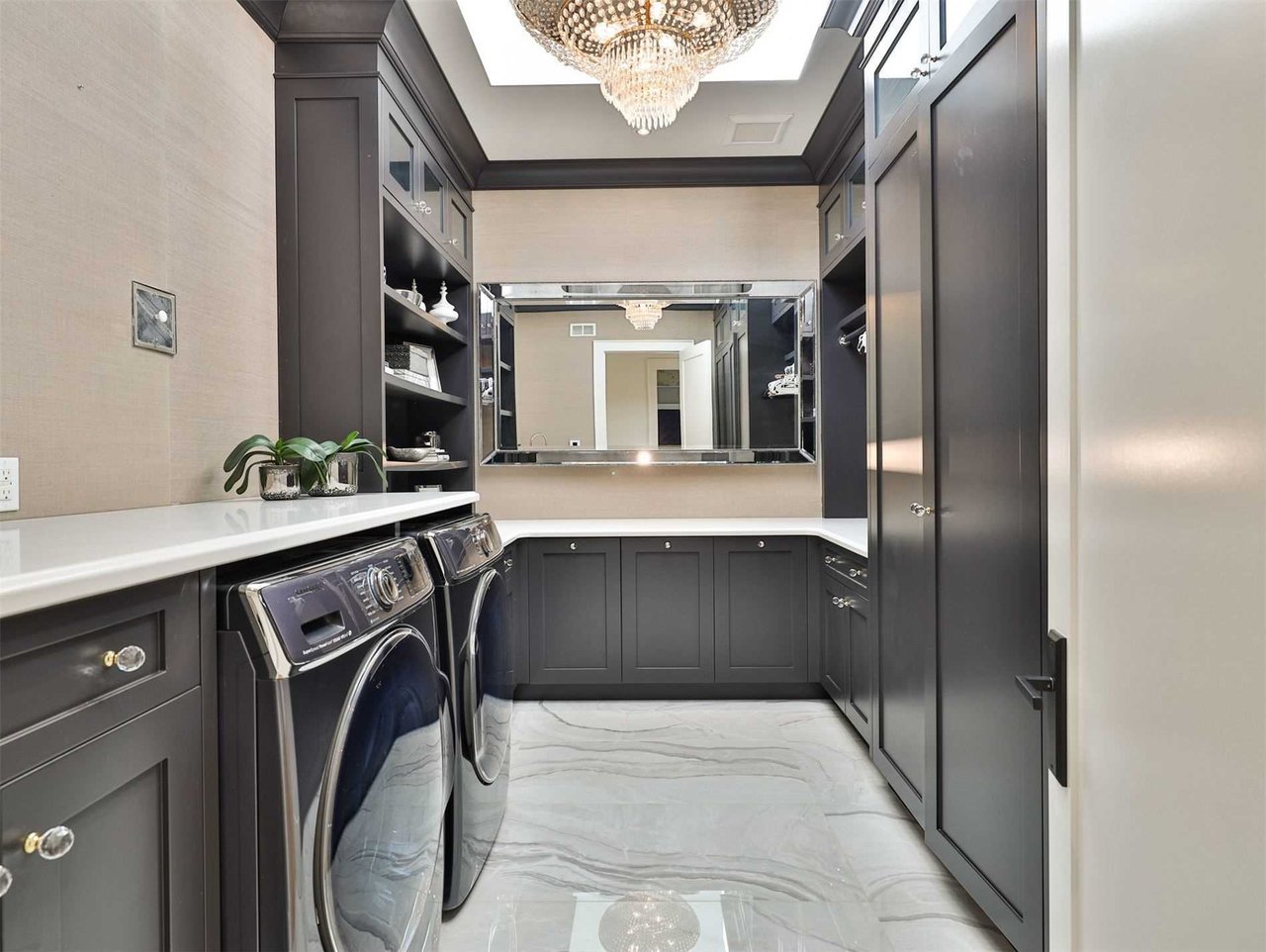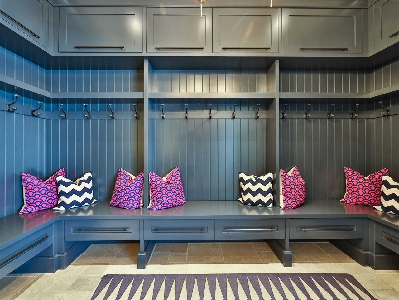 The Main Mudroom features heated marble floor, a light fixture, direct access from the garage, designer wallpaper, custom designed and crafted floor-to-ceiling cabinetry complete with a built in bench, hooks and bead board detailing.