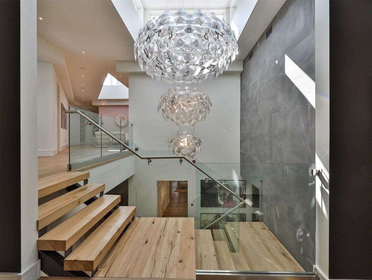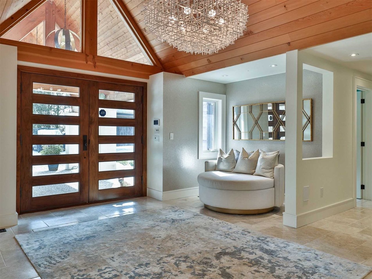 The Grand Hall features an oversized Sitting area, upper valence window, stone paneled accent wall, exquisite chandelier and a glass and steel railing.