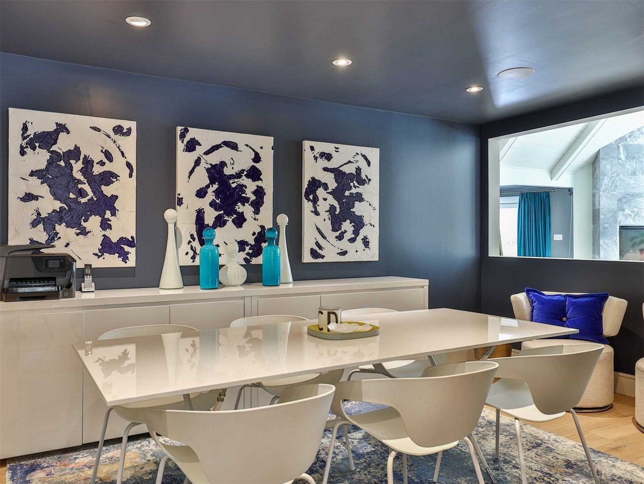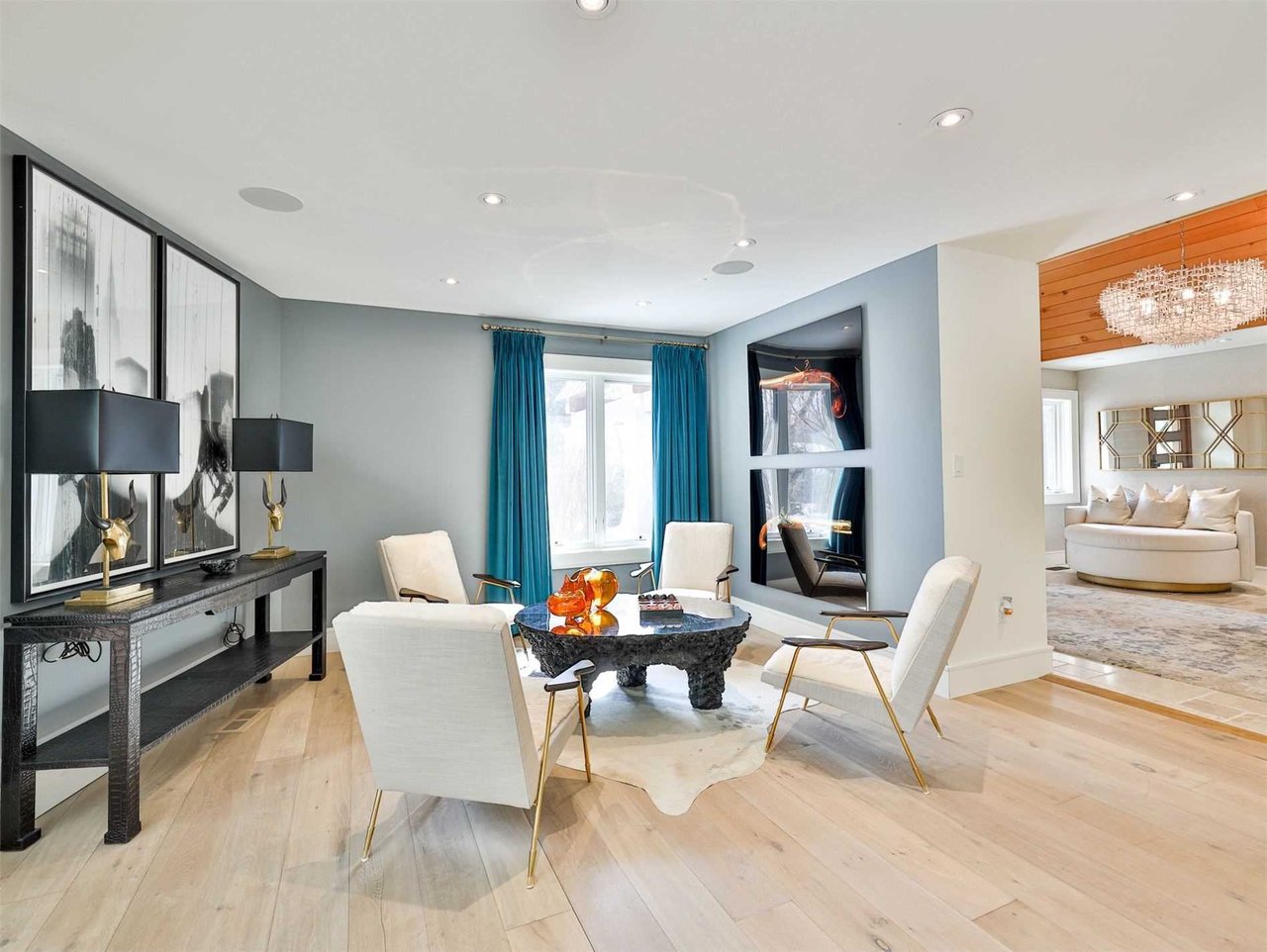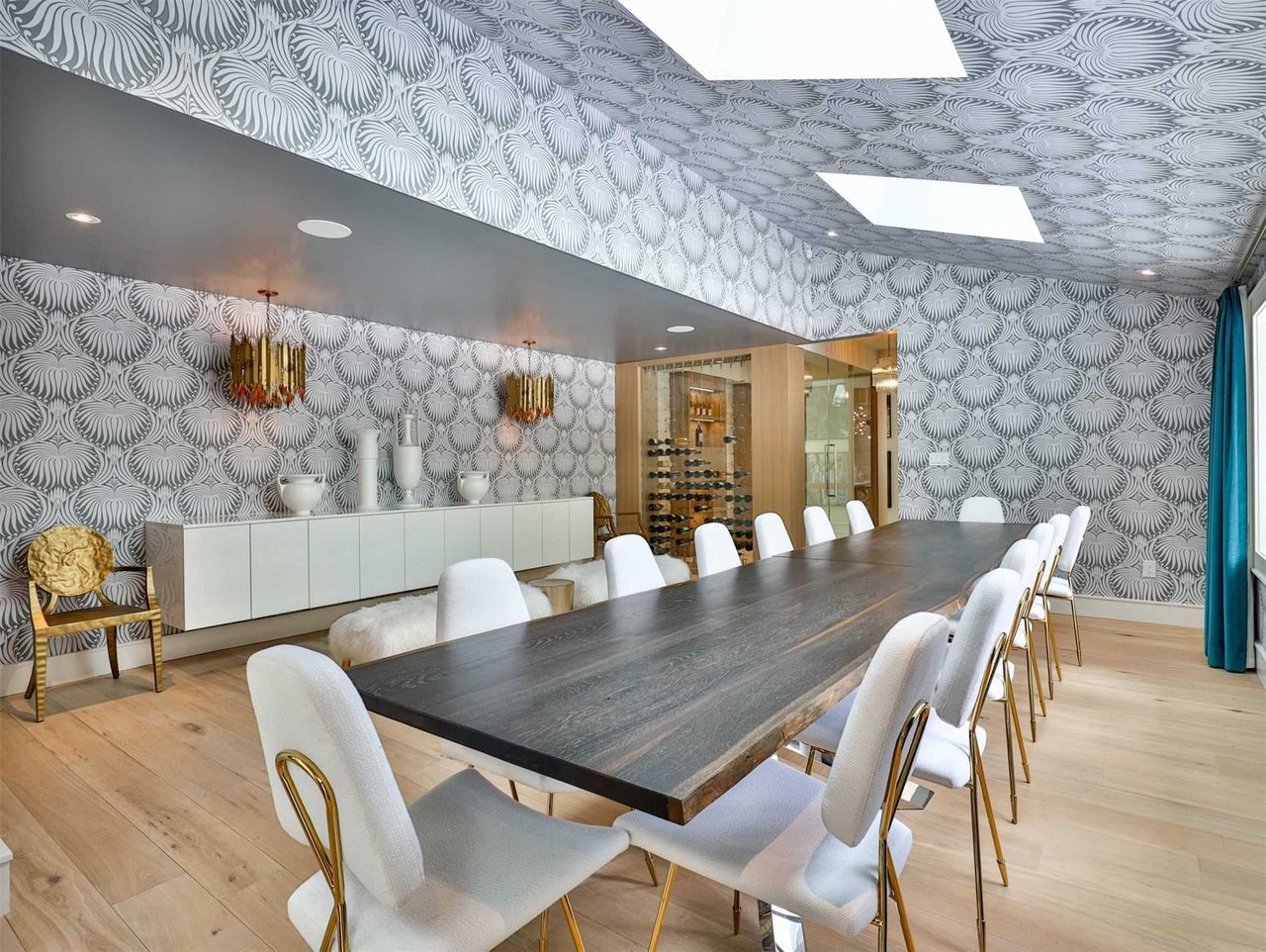 The formal Dining Room features hardwood floors, fabulous pendant lights, designer wallpaper, a wall of windows outfitted with drapery overlooking the rear gardens, skylights, pot lights, a custom built-in serving buffet and a glass wall looking into the Wine Cellar.