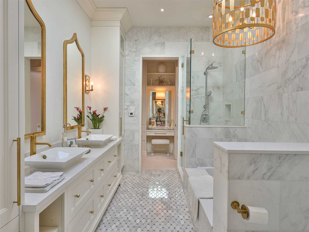 The 6-piece semi-ensuite bath features heated marble floor, pot lights, skylight, marble accent walls, a deep soaker tub, custom designed and crafted cabinetry, open display shelving, a wall-to-wall vanity complete with two vessel sinks, two mirrors, a chandelier and a seamless glass shower complete with a soap box, handheld faucet and a rain shower head.