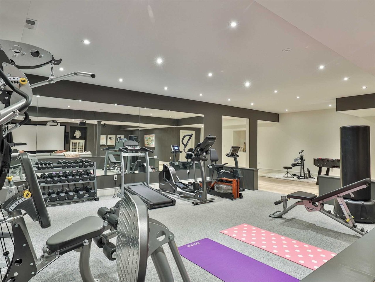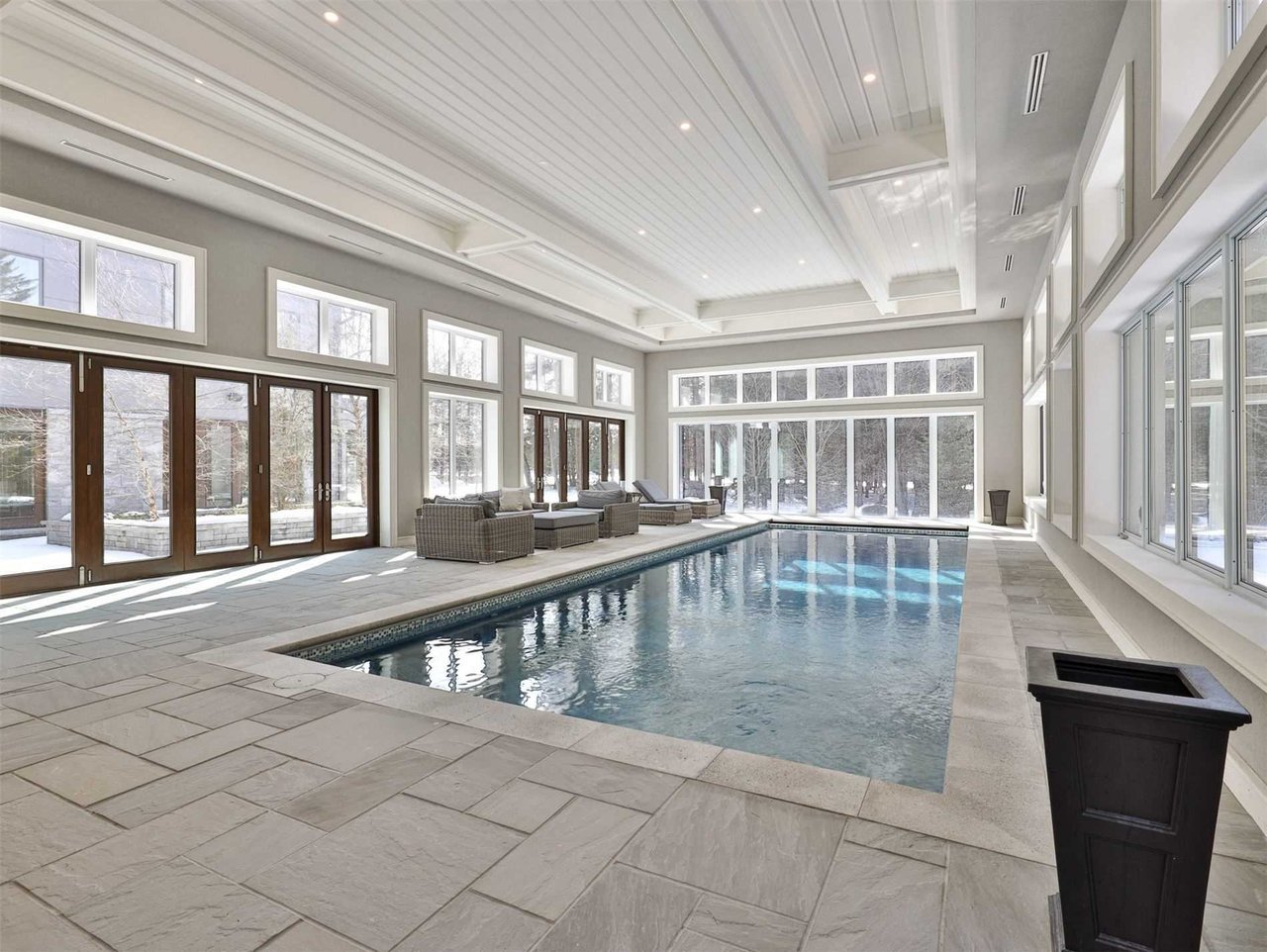 The sun drenched Swimming Pool Pavillion features a 3-piece washroom, a Betz salt water swimming pool complete with a stone surround, lighting system, water fountain, soaring cathedral ceilings, pot lights, floor-to-ceiling windows overlooking the gardens, an automated pool cover and multiple accordion doors completely opening up to the courtyard.