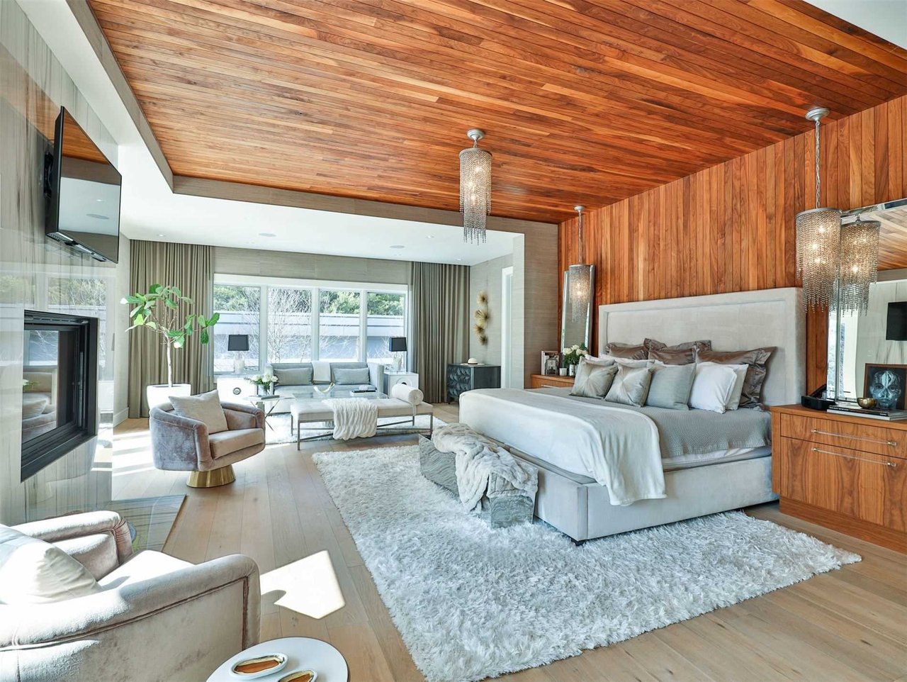 The Bedroom area features hardwood floor, pot lights, built-in speakers, coffered ceiling, chandelier, pendant lights, wood paneled ceiling, two separate walk outs opening onto the deck, wallpaper accents, a window outfitted with custom drapery overlooking the rear gardens, a wood paneled accent wall and a wood burning fireplace complete with a floor-to-ceiling mantle.