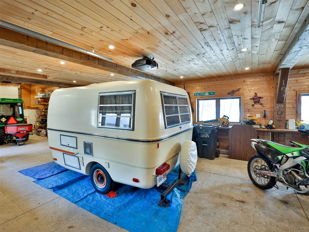 · A barn with two garage door entries featuring a storage room, wood paneled walls, beamed ceiling, built-in shelves, windows, built-in speakers and a projector and screen