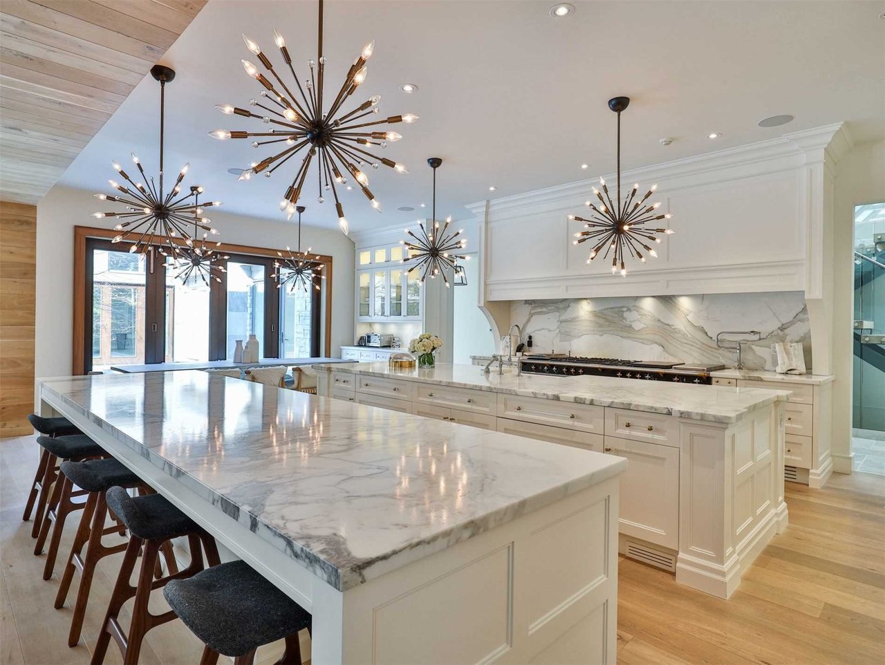 The Gourmet, chef inspired Kitchen, entered through an archway and open in design to the Breakfast Area and Family Room, features custom designed and crafted cabinetry, built-in speakers, under valence lighting, crown moldings, soft closing drawers and cabinets, dovetailing, pot lights, pendant lights, hardwood floor, pot filler, leathered marble countertop and backsplash, illuminated glass cabinets, pantry cabinets and two expansive center islands, one designated for cooking and the other for eating with a large breakfast bar.