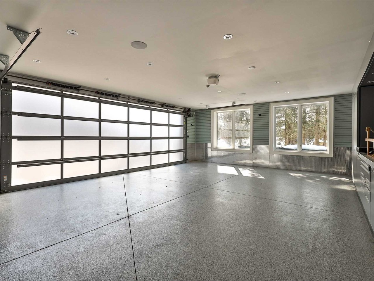 · 4 car garage with custom siding, storage room, speakers, workshop, epoxy floor and windows.