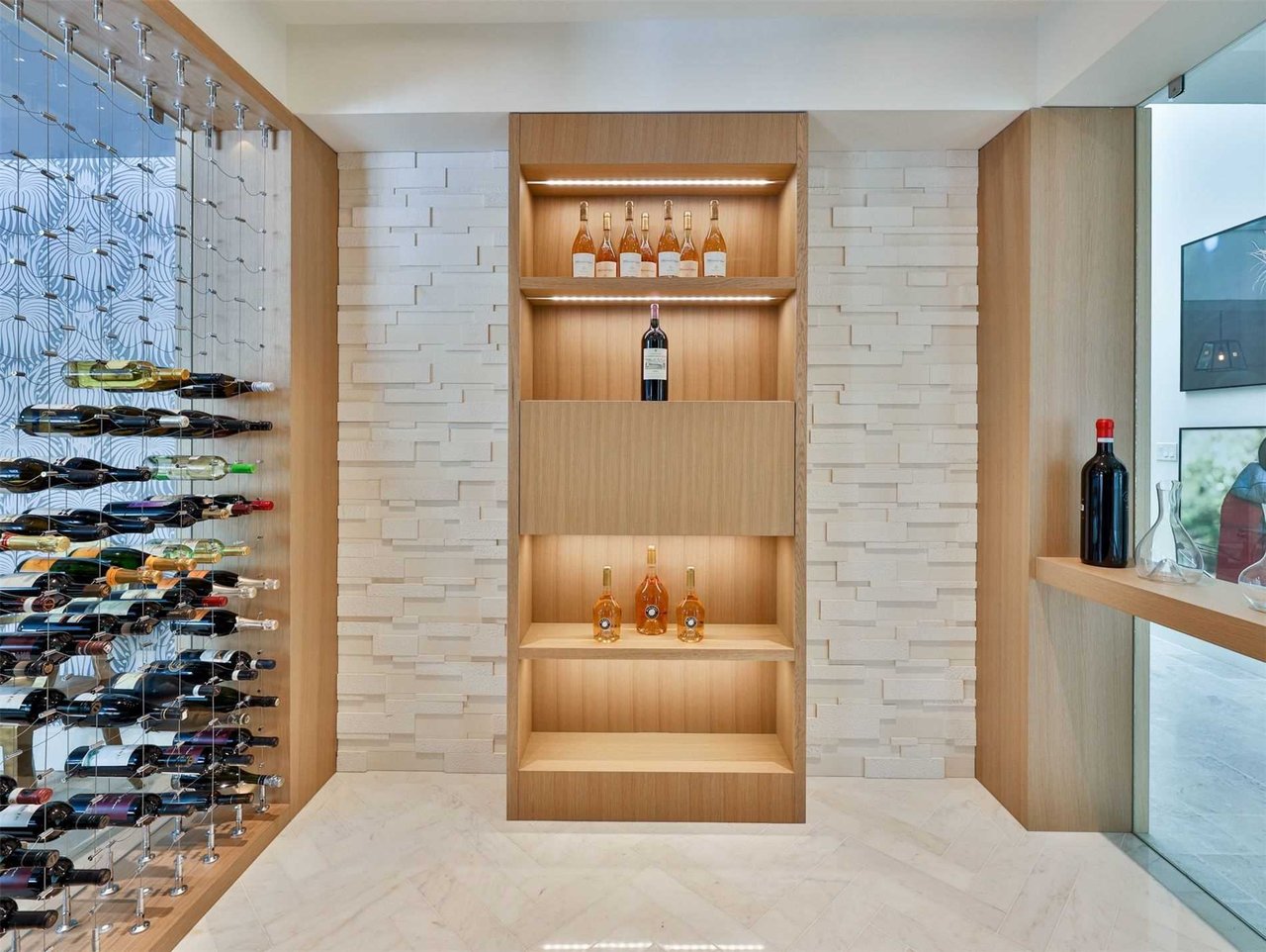 The temperature controlled Wine Cellar, open in design to the Wet Bar, features a glass wall overlooking the Dining Room, marble floor laid in a herringbone pattern, pot lights and custom designed and crafted wine shelving.
