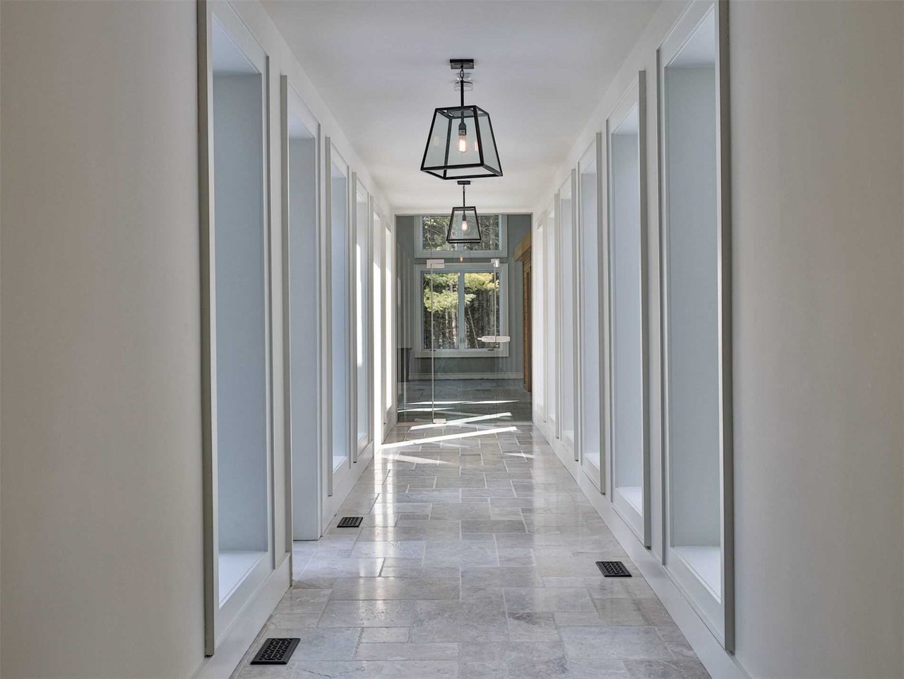 The window lined Pool Corridor, overlooking the courtyard, features heated marble floor, coffered ceiling, a light fixture, a door opening onto the Swimming Pool Pavillion and a door opening onto the courtyard.