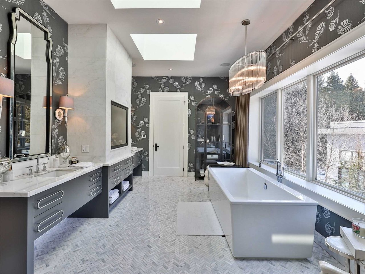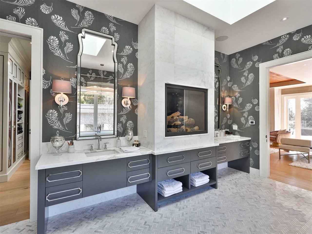 The opulent 9-piece marble ensuite, features heated marble floor laid in a herringbone pattern, pot lights, skylights, built-in speakers, designer wallpaper, light sconces, separate “His” and “Hers” vanities complete with marble countertop and under mount sinks, ample storage, a gas fireplace complete with a marble mantle, a seamless glass door housing the water closet, open display shelving, an expansive seamless glass shower with a marble surround, marble bench, rain shower head, body jets, steam unit, handheld faucet and a French drain.
