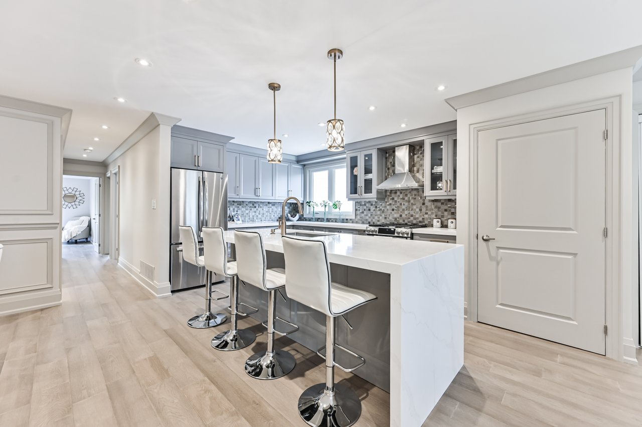 Welcome to this beautifully renovated, bright 3+2 bedroom raised bungalow situated on a premium 30' x 125' lot in central Mississauga. Fully renovated from top to bottom, both inside and out! Showcasing quality finishes and craftsmanship. The main floor features a stunning open concept custom kitchen with stainless steel appliances, a massive waterfall island with quartz counters and a breakfast bar, mirror mosaic backsplash, and brushed gold accents and hardware; open concept living and dining room; wide plank hardwood floors; wainscoting; crown moulding; master bedroom retreat with a 3-piece ensuite, walk-in closet and walk-out to patio; 2 additional spacious bedrooms; laundry room; and pot lights throughout. The bright lower level consists of a 2-bedroom in-law suite with 2 separate entrances; an open concept layout with a combined kitchen, family room and dining area; a custom kitchen with quartz counters, porcelain backsplash, large centre island with breakfast bar seating and stainless steel appliances; 4-piece bathroom; an additional laundry room; and pot lights throughout. Please review the detailed upgrades list for a complete list of all renovations and upgrades.