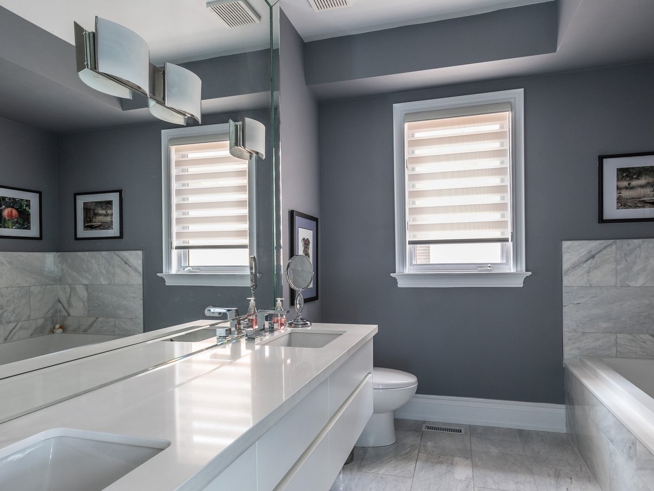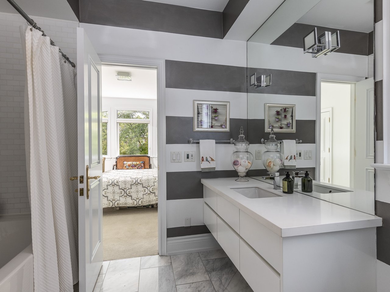 The 4-piece semi-ensuite bath features heated marble floor, lights sconces, a window outfitted with California shutters overlooking the side gardens, a mirror, a custom vanity with a ceasarstone countertop, under mount sink and a shower/tub combination with a stationary faucet.