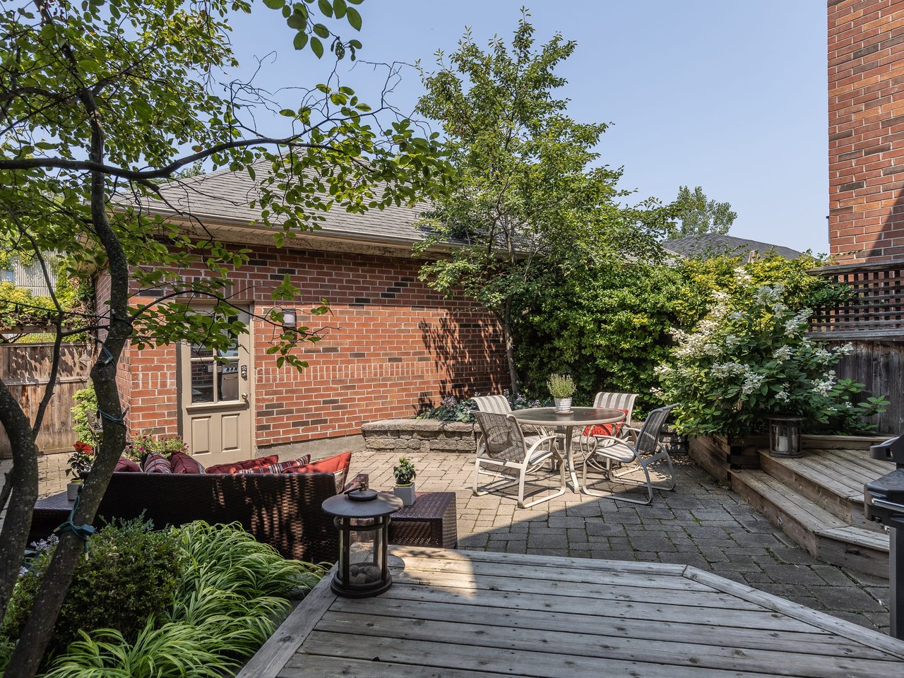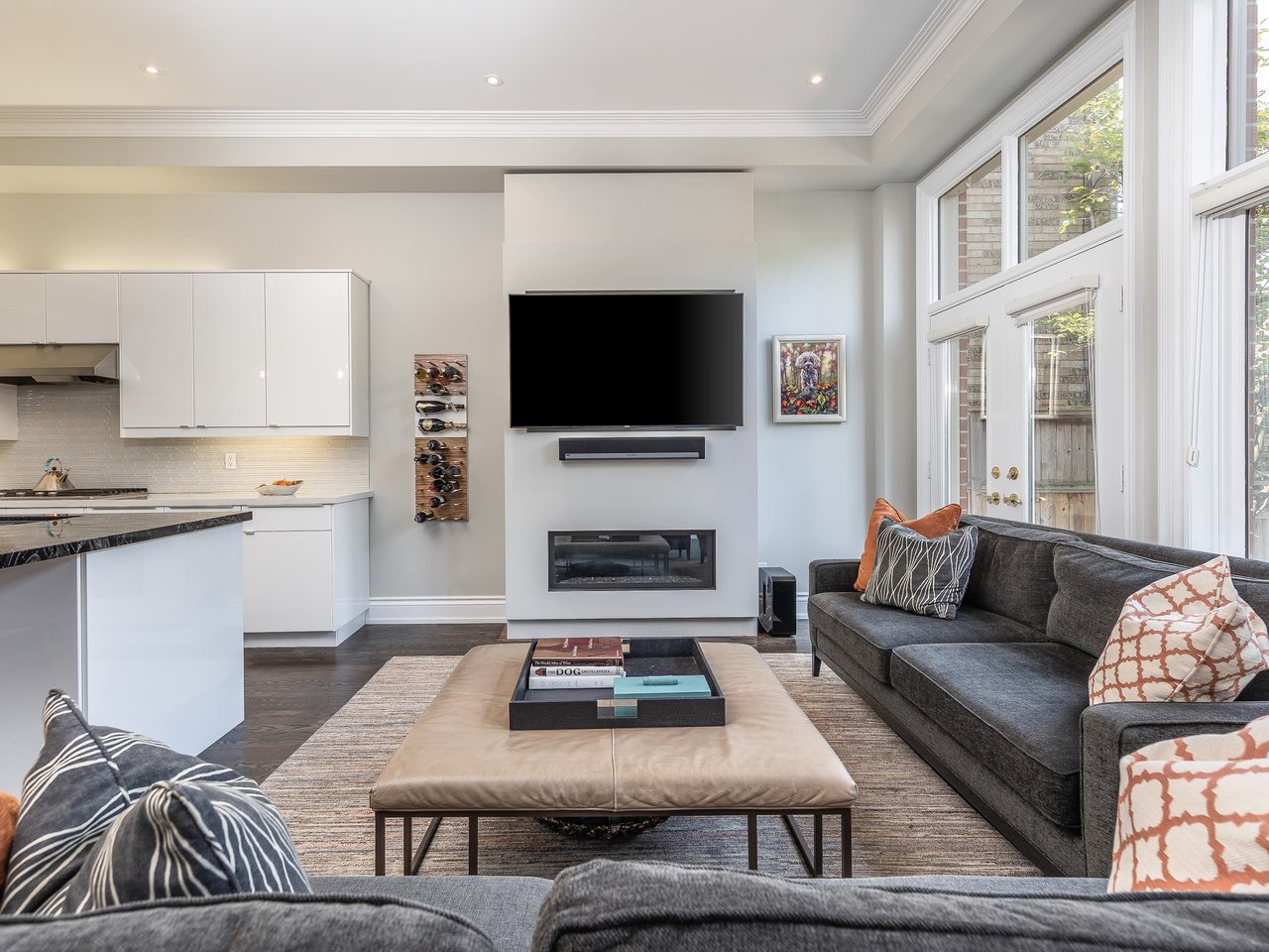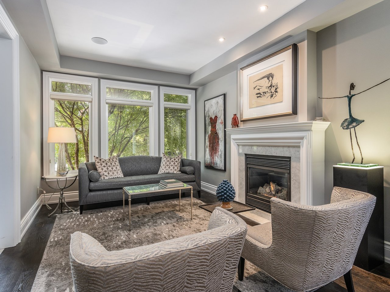 The Family Room, open in design to the Kitchen and Breakfast Area, features oak hardwood floor a gas fireplace, crown molding, pot lights and multiple walk outs leading to the terrace and gardens.