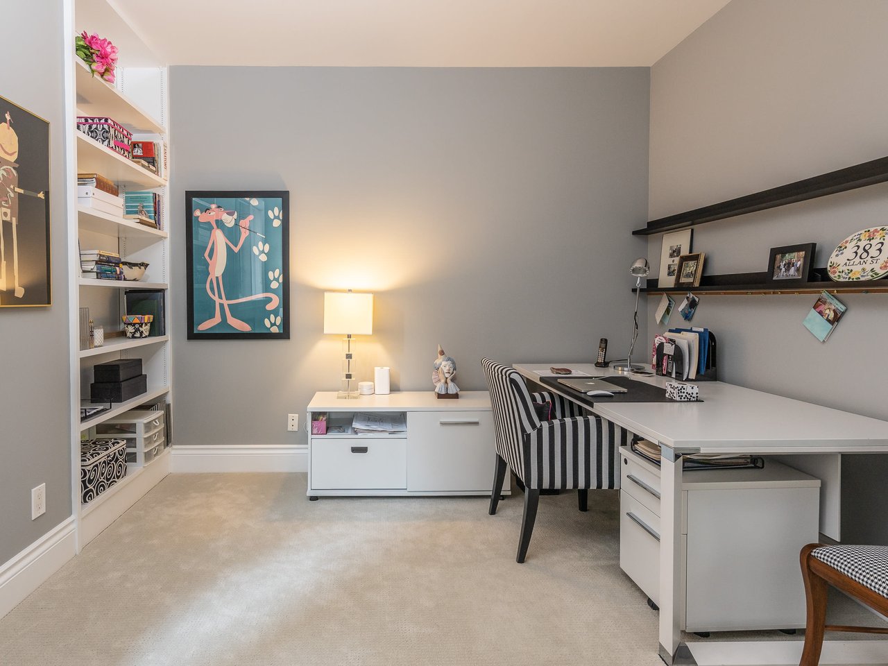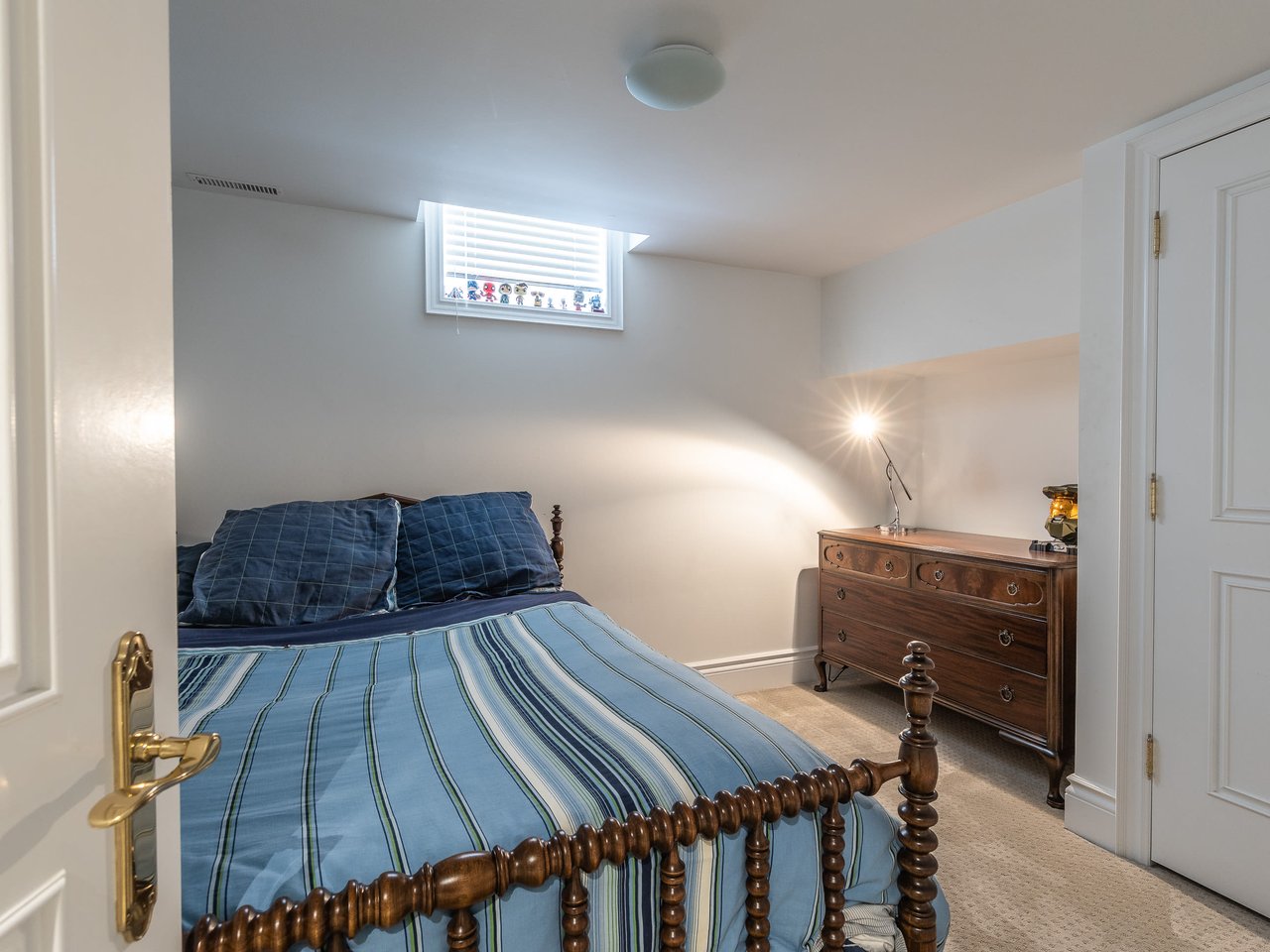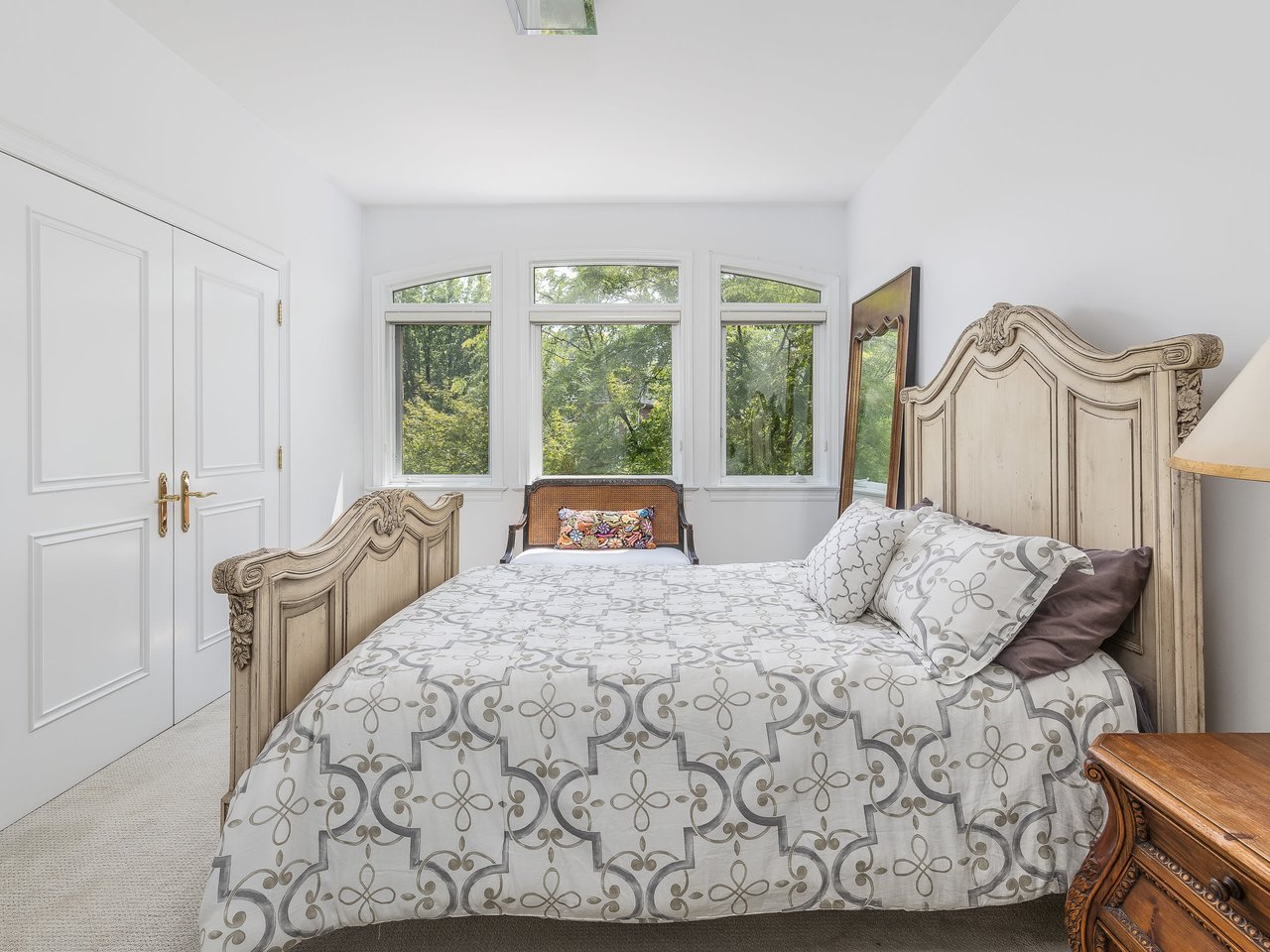 The Third Bedroom features a 4-piece semi-ensuite, broadloom floor, a double closet, a light fixture, a window outfitted with blinds overlooking the side gardens and custom designed and crafted built-in open shelving.