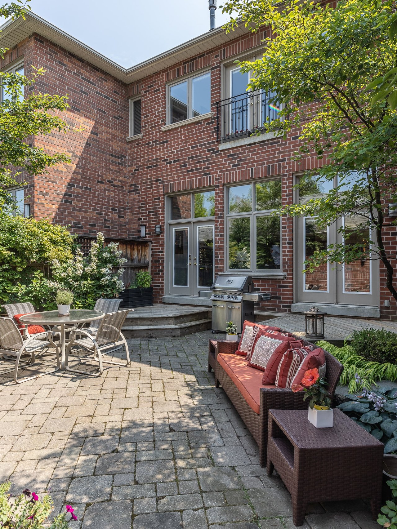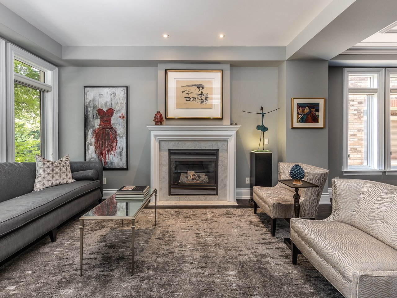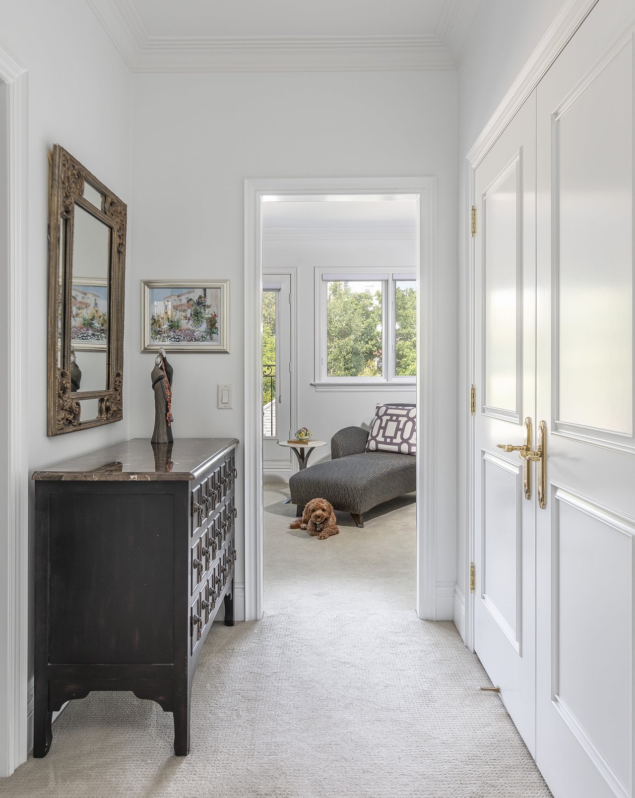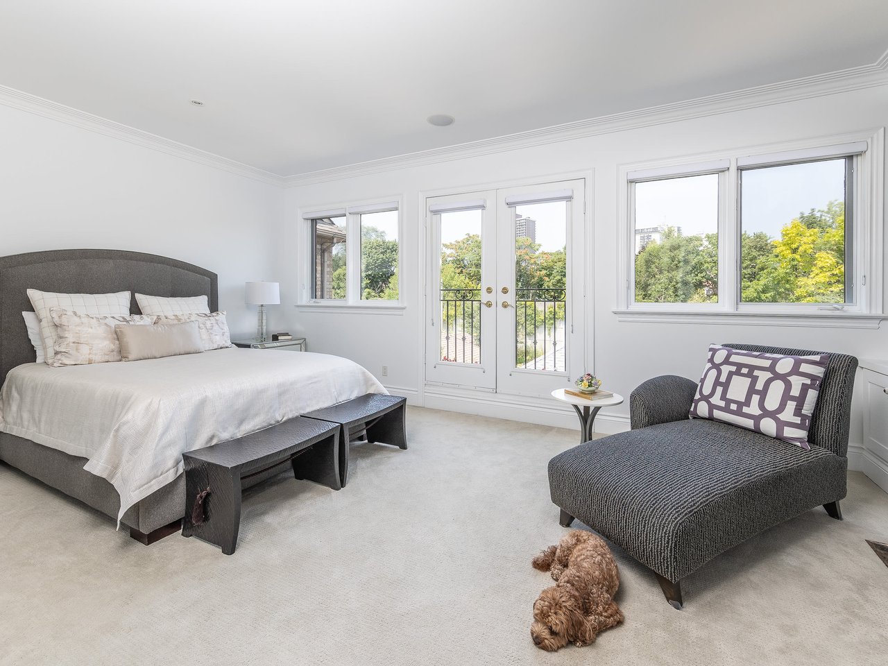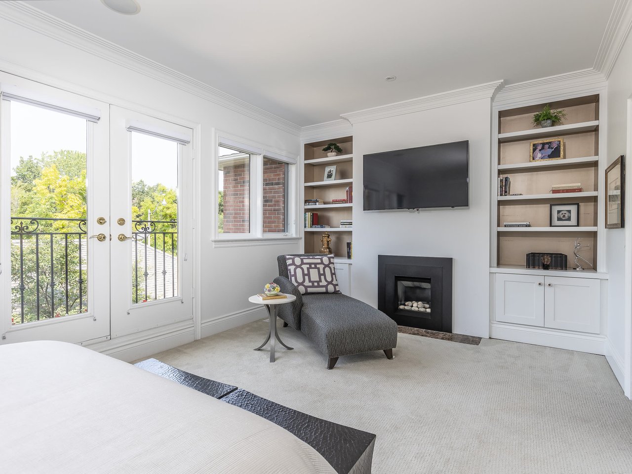 The private Master Bedroom features broadloom floor, crown molding, pot lights, a gas fireplace complete with custom built-in open shelving and closed cabinets. The Master also features windows outfitted with blinds overlooking the rear gardens, “His” and “Hers” walk-in closets complete with custom built-ins and a pair of doors opening onto the Juliet balcony.