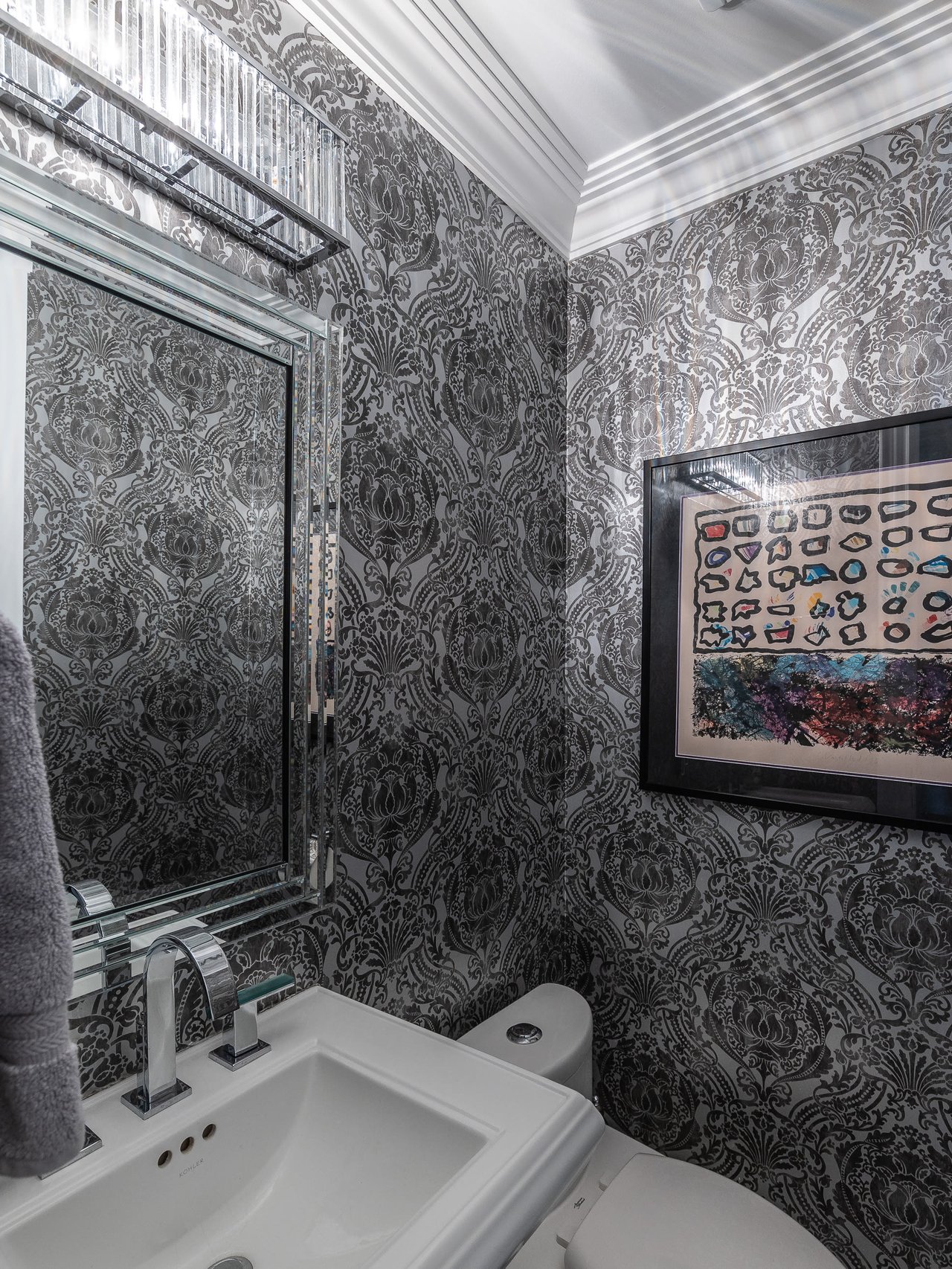 The 2-piece Powder Room features marble floor, crown molding, light sconce, mirror, designer wallpaper and a pedestal sink.