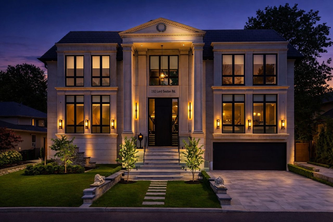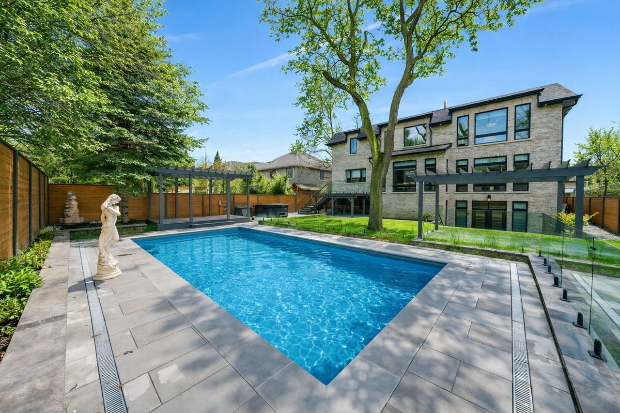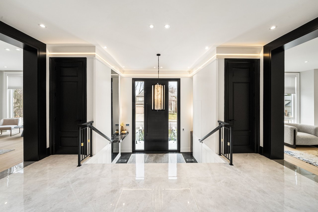 This exceptional newly built luxury residence offers nearly 10,000 sq ft of beautifully finished living space on a prestigious south-facing 68' x 150' lot, delivering remarkable scale, craftsmanship, and architectural elegance. Featuring 5+1 oversized bedrooms, each with its own private ensuite and walk-in closet, the home is designed for ultimate comfort, privacy, and modern family living. Grand ceiling heights create an extraordinary sense of space with 10-ft ceilings on the main level, 9-ft ceilings on the second floor, and a breathtaking 14-ft grand foyer, while the 11-ft lower level provides a bright and expansive walk-up basement ideal for entertaining. The striking natural limestone facade is framed by six custom columns inspired by the U.S. Capitol, with hand-crafted capitals that create a distinguished presence rarely seen in Toronto. The home's symmetrical design and incorporation of the Golden Ratio create a sense of balance, harmony, and timeless elegance throughout. Designed for exceptional indoor-outdoor living, the spectacular backyard retreat features a heated saltwater concrete pool, pergola, outdoor BBQ area, and professionally landscaped grounds. Additional exterior highlights include a heated driveway, extensive stone walkways, and a rare 3-car garage. Inside, the home is fully equipped with a Control4 smart lighting system, in-floor heating (where applicable), and a sophisticated whole-home audio system with surround sound in the family room, lower level entertainment space, and theatre, plus wiring for backyard audio. Additional luxury amenities include four fireplaces, a jacuzzi, dry and steam sauna, and a stunning primary suite retreat. Conveniently located just minutes from York Mills Subway Station, Highway 401, and within close proximity to Toronto's top private schools, shops, and amenities. A rare offering in one of the city's most prestigious communities.