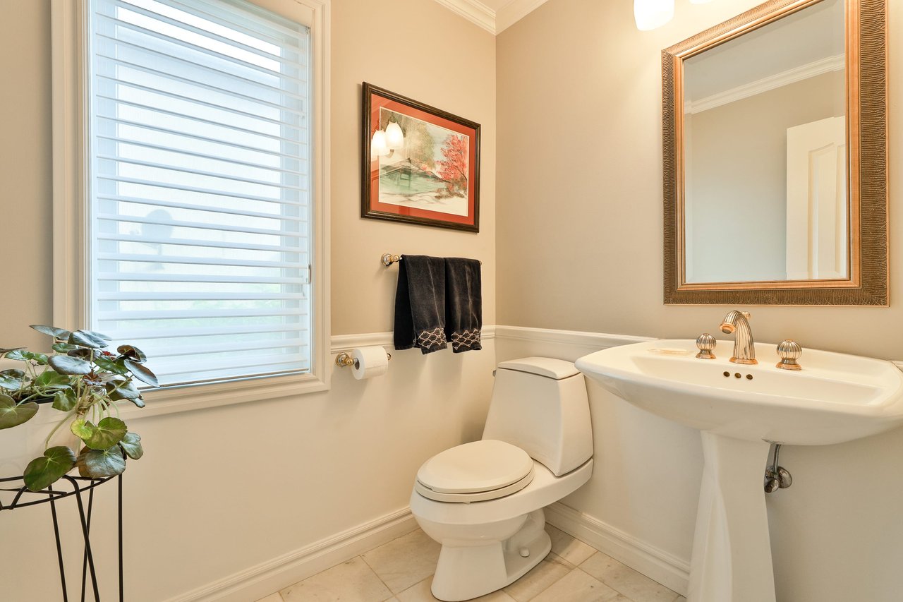 The 2-piece Powder Room features a pedestal sink, marble floor, mirror, light sconce, crown molding and a window outfitted with blinds overlooking the side gardens.