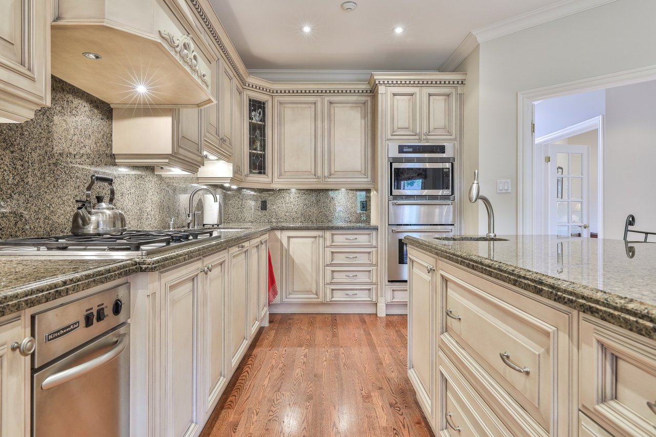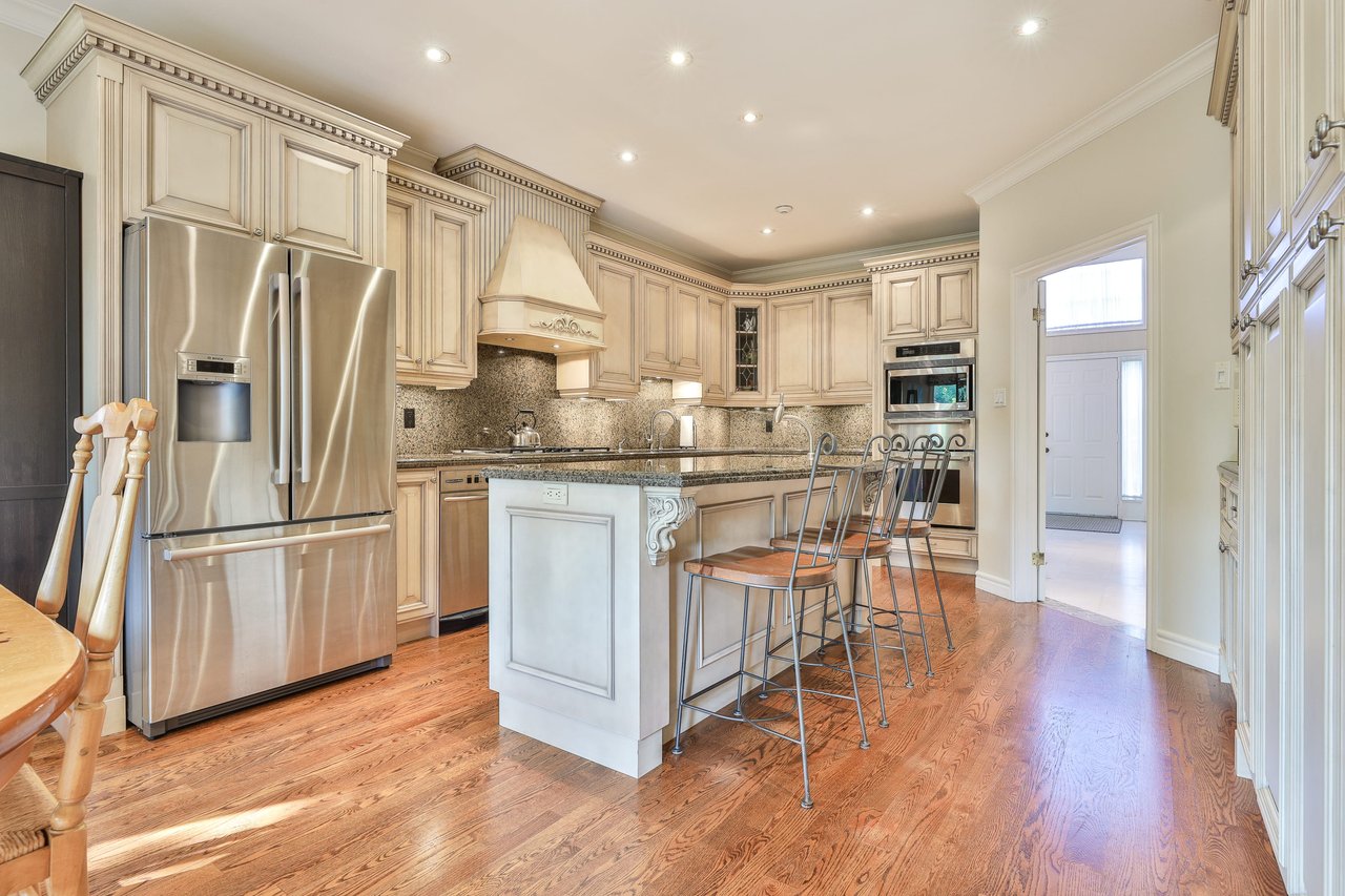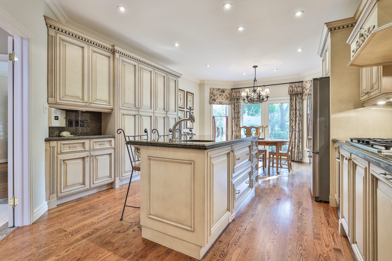 The Gourmet, chef inspired Kitchen, entered through a pair of double doors off of the Foyer and open in design to the Breakfast Area, features oak hardwood floor, crown molding, pot lights, a pair doors opening onto the Family Room, granite countertop and backsplash, under valence lighting, central vacuum kick sweep, custom designed and crafted cabinetry, several leaded glass front display cabinets, a dual bowl stainless steel under mount sink complete with a soap dispenser, custom built-in pantry cabinets and an expansive center island complete with a breakfast bar, ample storage and an additional stainless steel under mount sink.