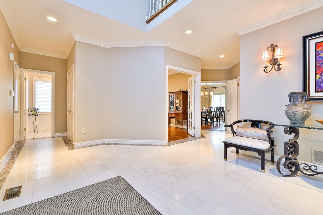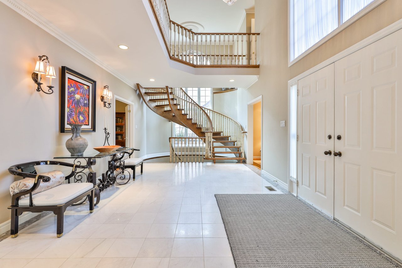 The Grand Foyer features light sconces, an entry door complete with glass side lights, upper valence window, cathedral ceilings, crown molding, a light fixture, chandelier medallion, entries opening onto principal rooms, a double cloak closet, marble floor and an offside sweeping staircase complete with a wood handrail and white pickets.