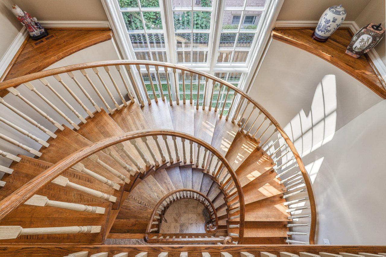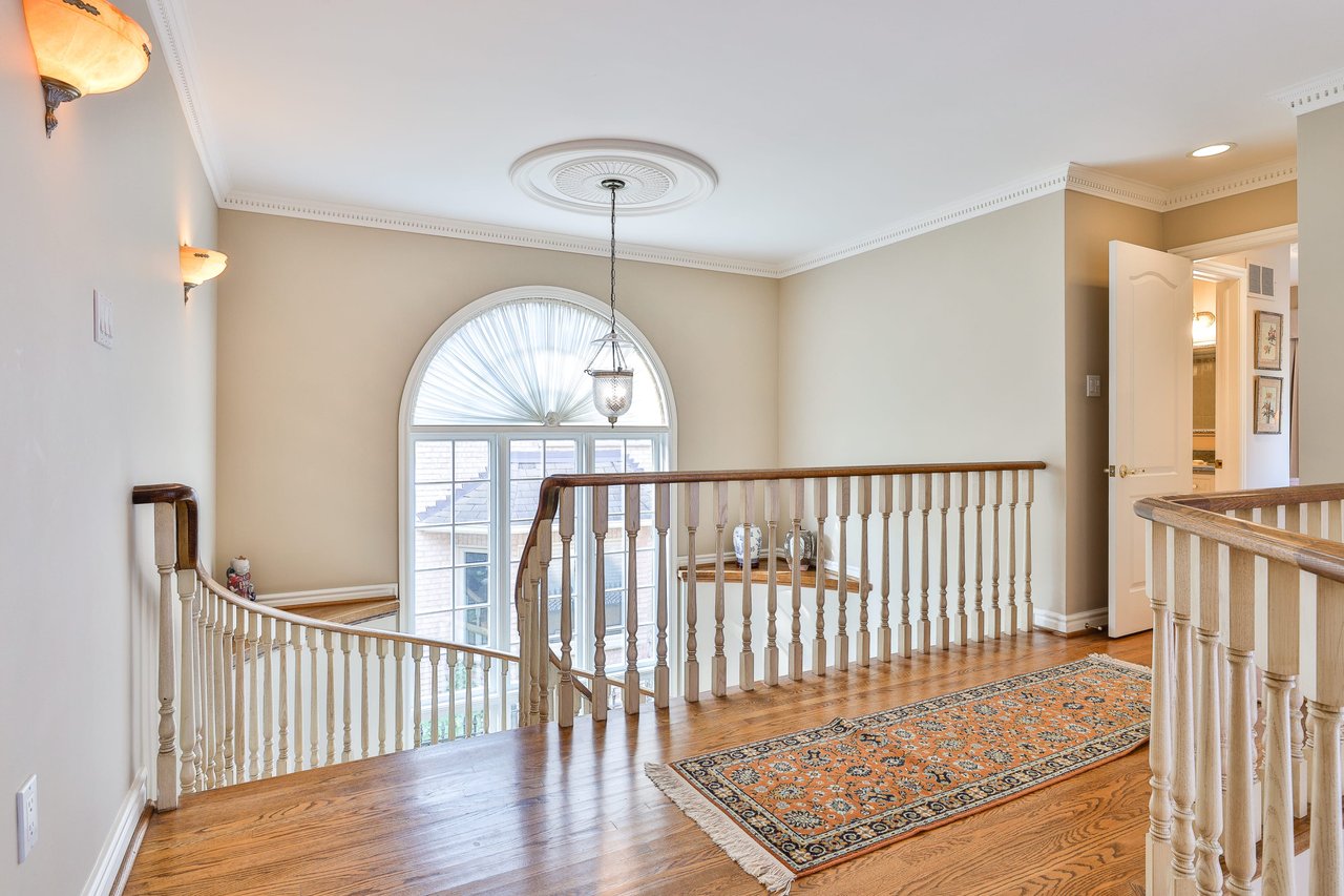 The Grand Hall, overlooking the Foyer, features oak hardwood floor, crown molding, light sconces, a linen closet and an expansive window overlooking the side gardens.