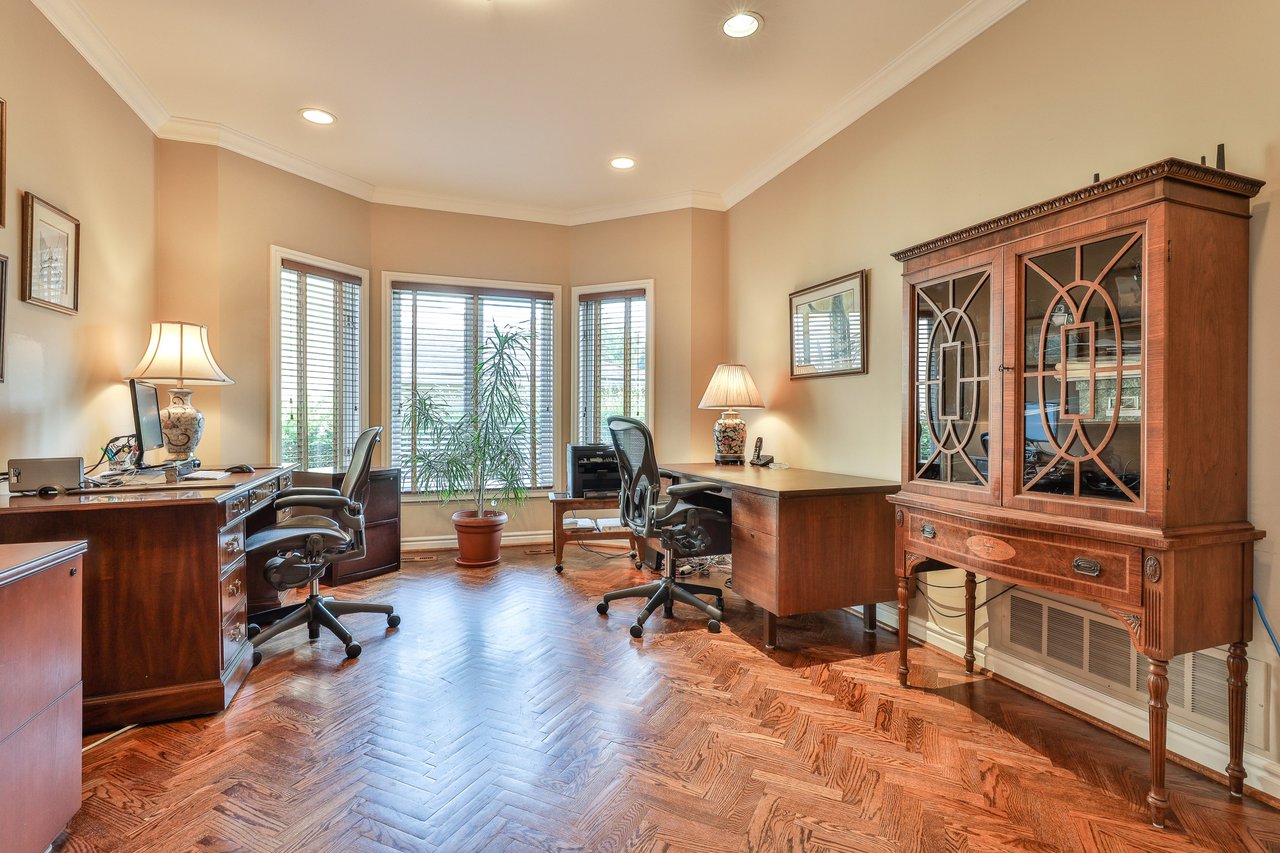 The Library, entered through a pair of French doors, features oak hardwood floor laid in a herringbone pattern, crown molding, pot lights, a light fixture and a Bay window outfitted with blinds overlooking the side gardens.