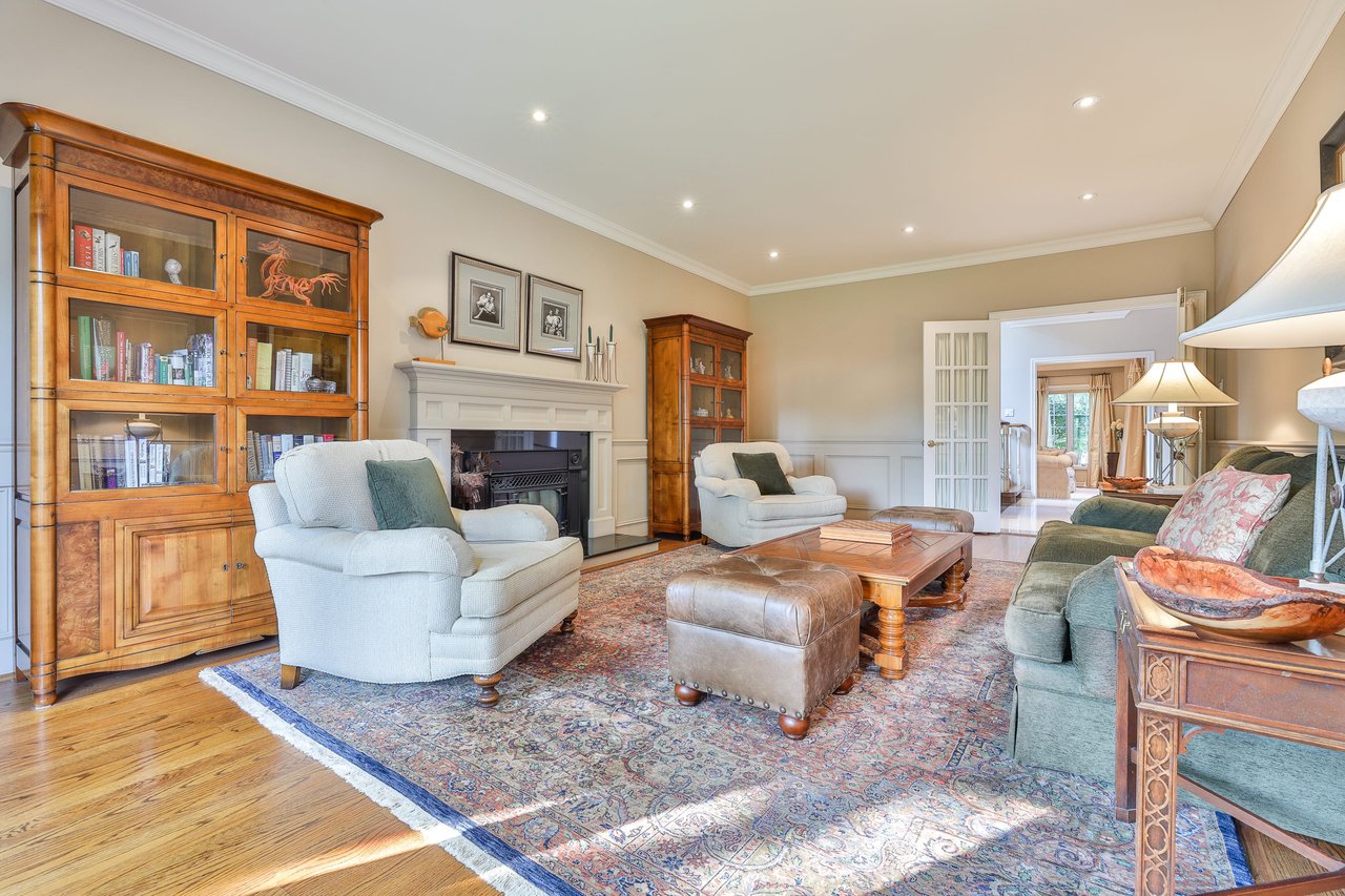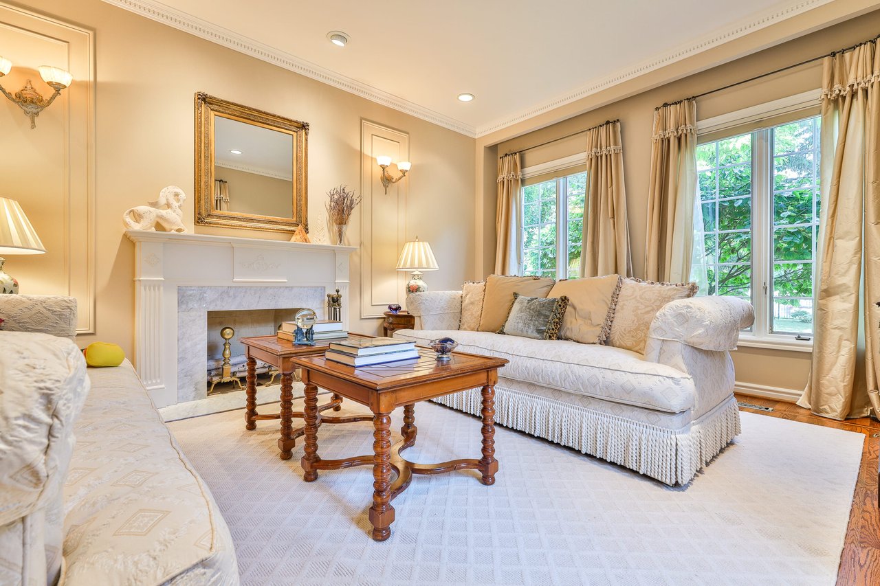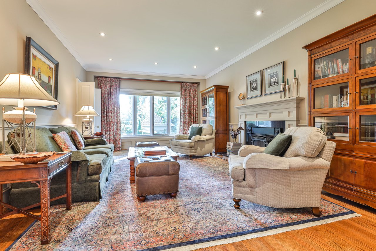 The formal Living Room, sunken in design and entered through an archway off of the Foyer, features oak hardwood floor, crown molding, pot lights, light sconces, applied wall molding, windows outfitted with custom drapery overlooking the side and front gardens and a wood burning fireplace with a marble surround.