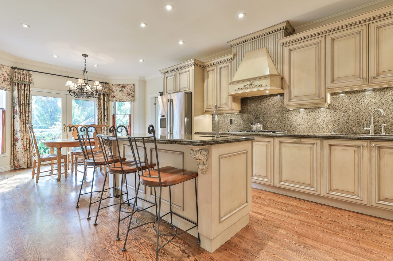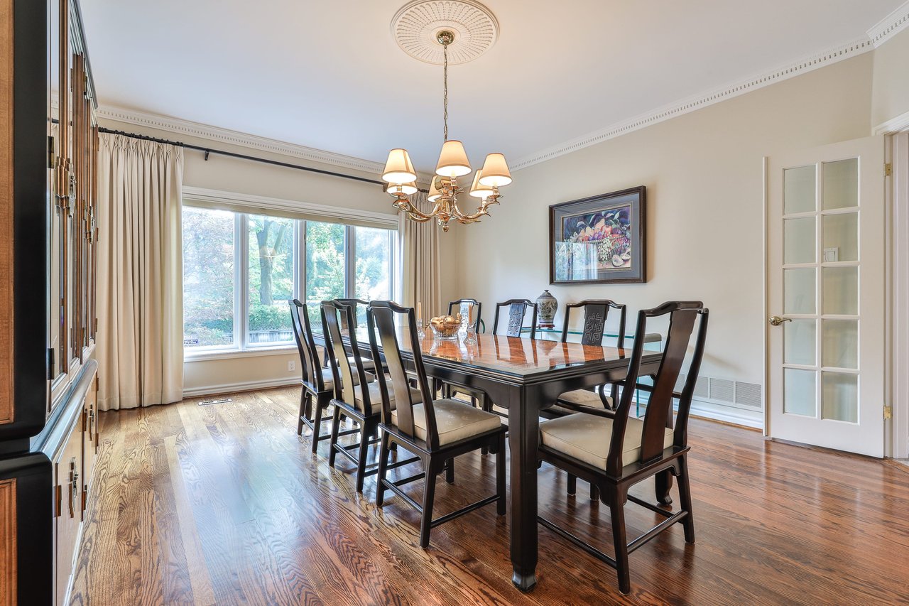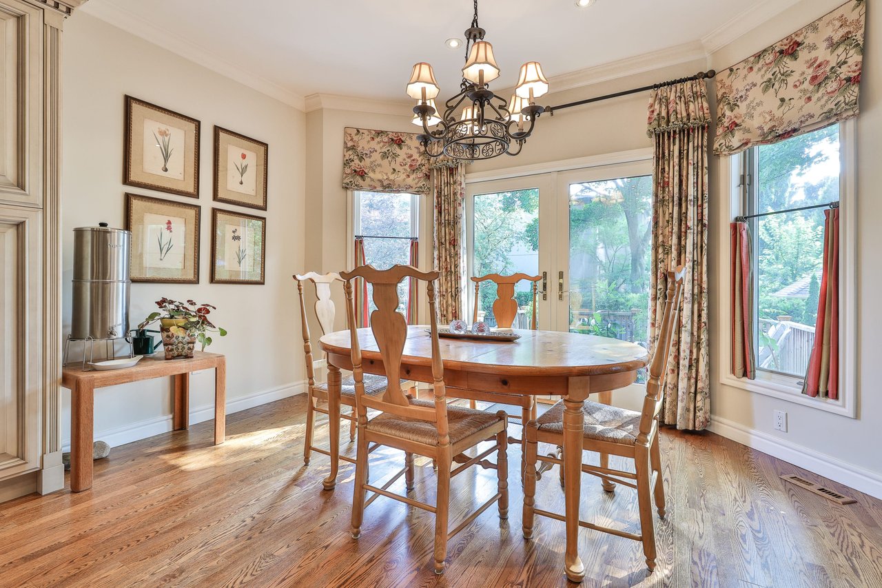 The Breakfast Area, open in design to the Kitchen, features oak hardwood floor, pot lights, chandelier, windows outfitted with drapery overlooking the rear gardens and two walk outs to the decks and gardens.