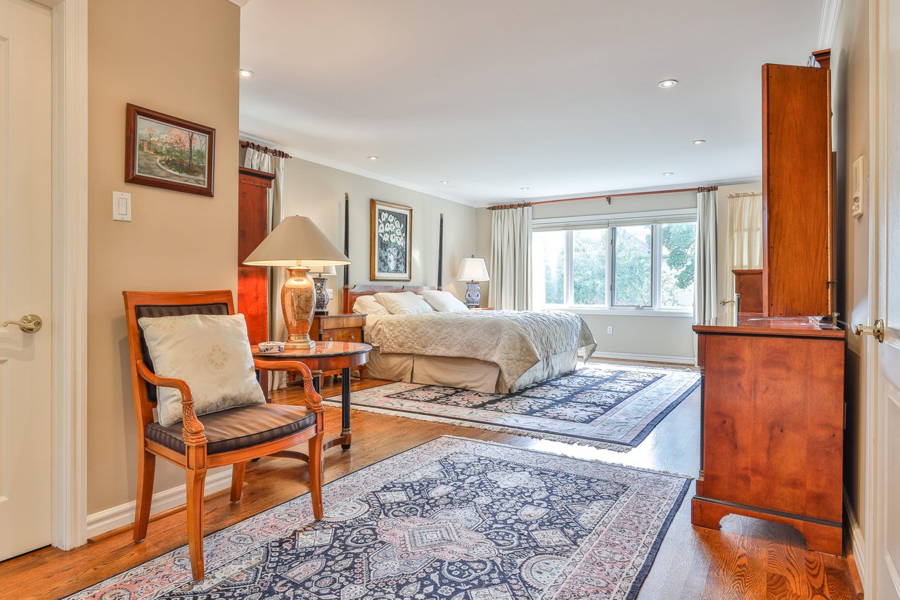 The sprawling private Master Suite features “His” and “Hers” walk-in closets, a 7-piece ensuite, a light fixture, oak hardwood floor, crown molding, pot lights, a picture window outfitted with custom blinds and drapery overlooking the rear gardens and a pair of French doors opening onto the Fifth Bedroom that can alternatively be used as a Sitting Room.