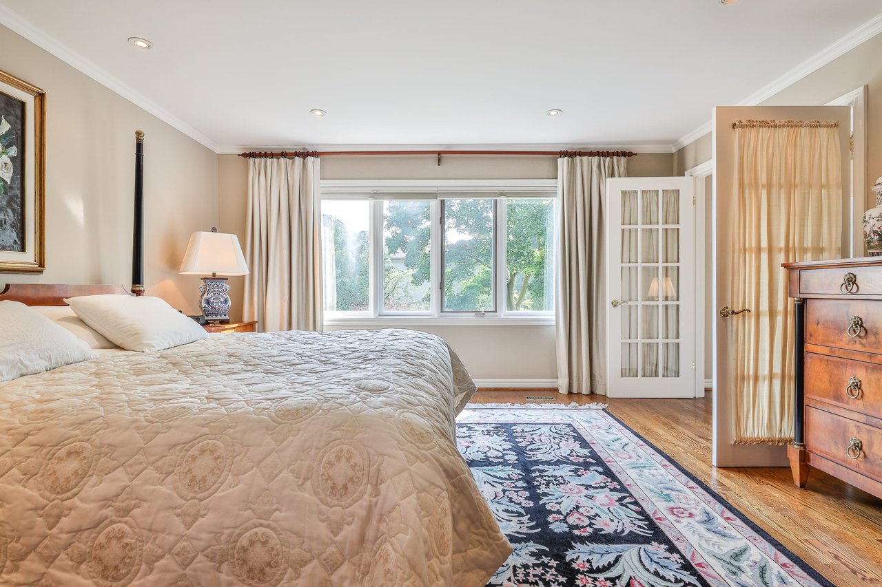 The Fifth Bedroom features oak hardwood floor, crown molding, pot lights, a pair of French doors opening onto the Primary Bedroom, a closet and a picture window outfitted with custom blinds overlooking the rear gardens.