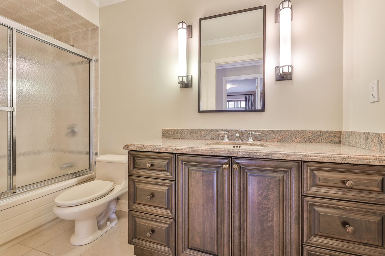 The 4-piece ensuite features marble floor, a shower/tub combination, a custom vanity, light sconce and a mirror.