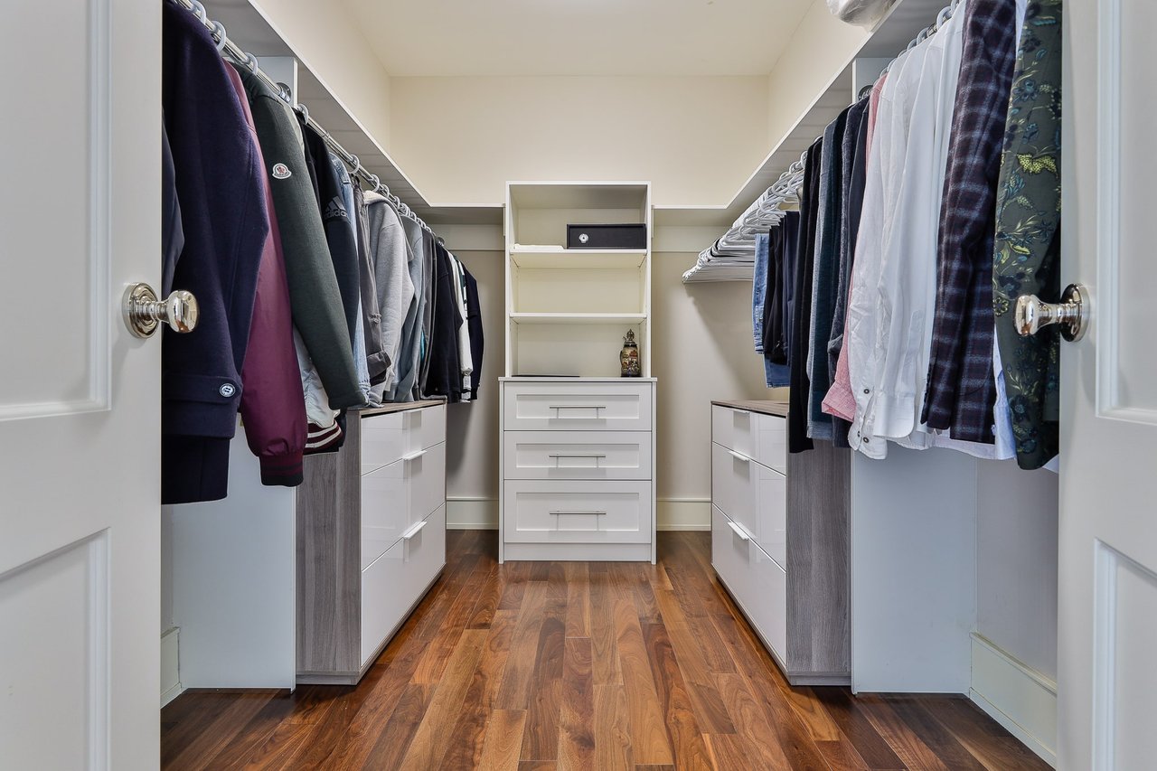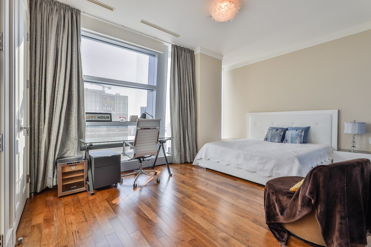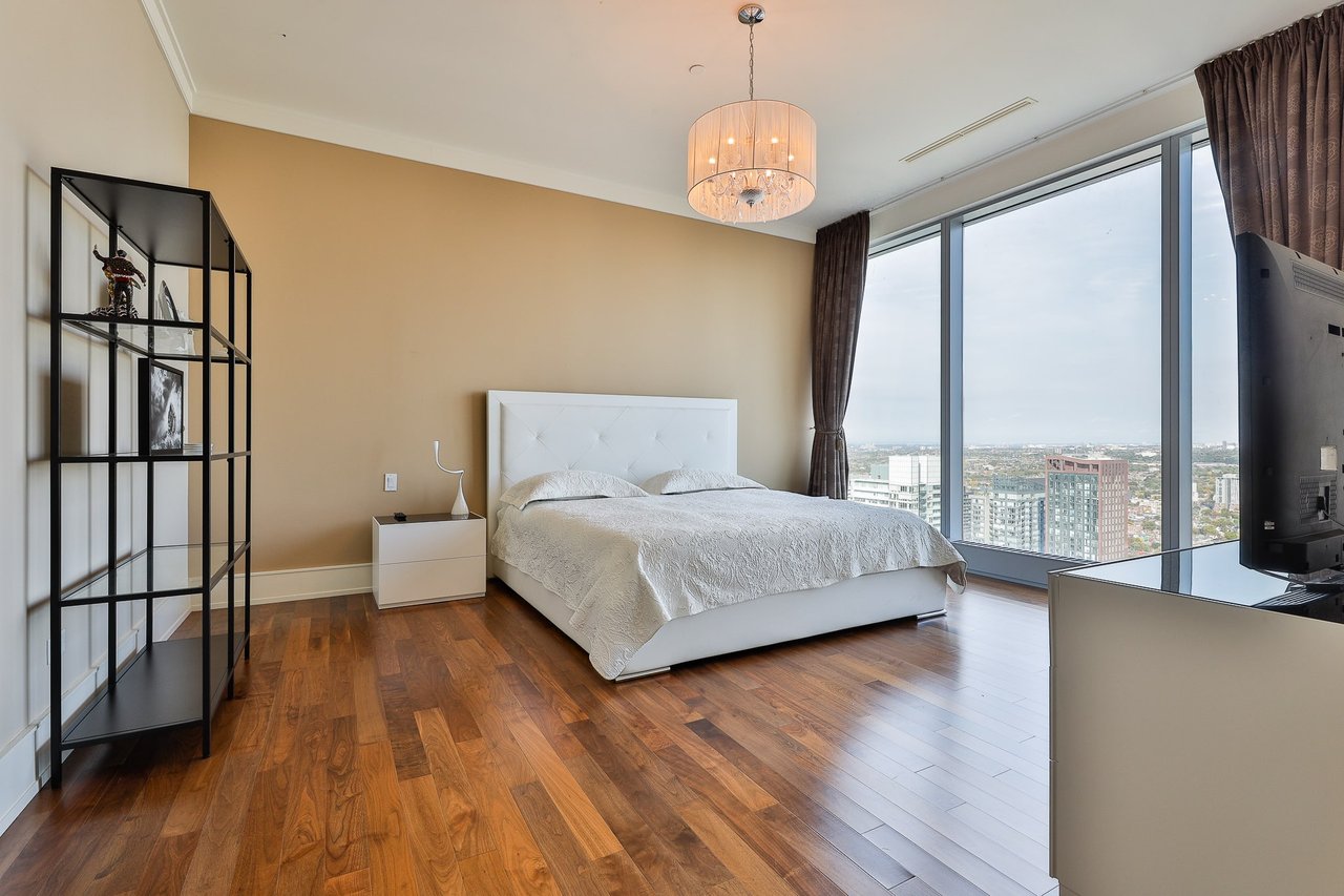The private Primary Bedroom Suite, entered through a pair of double doors, features an expansive walk-in closet, a luxurious 8-piece ensuite, a double closet, hardwood floor, crown molding, chandelier and wall-to-wall, floor-to-ceiling windows outfitted with custom drapery overlooking the North views.