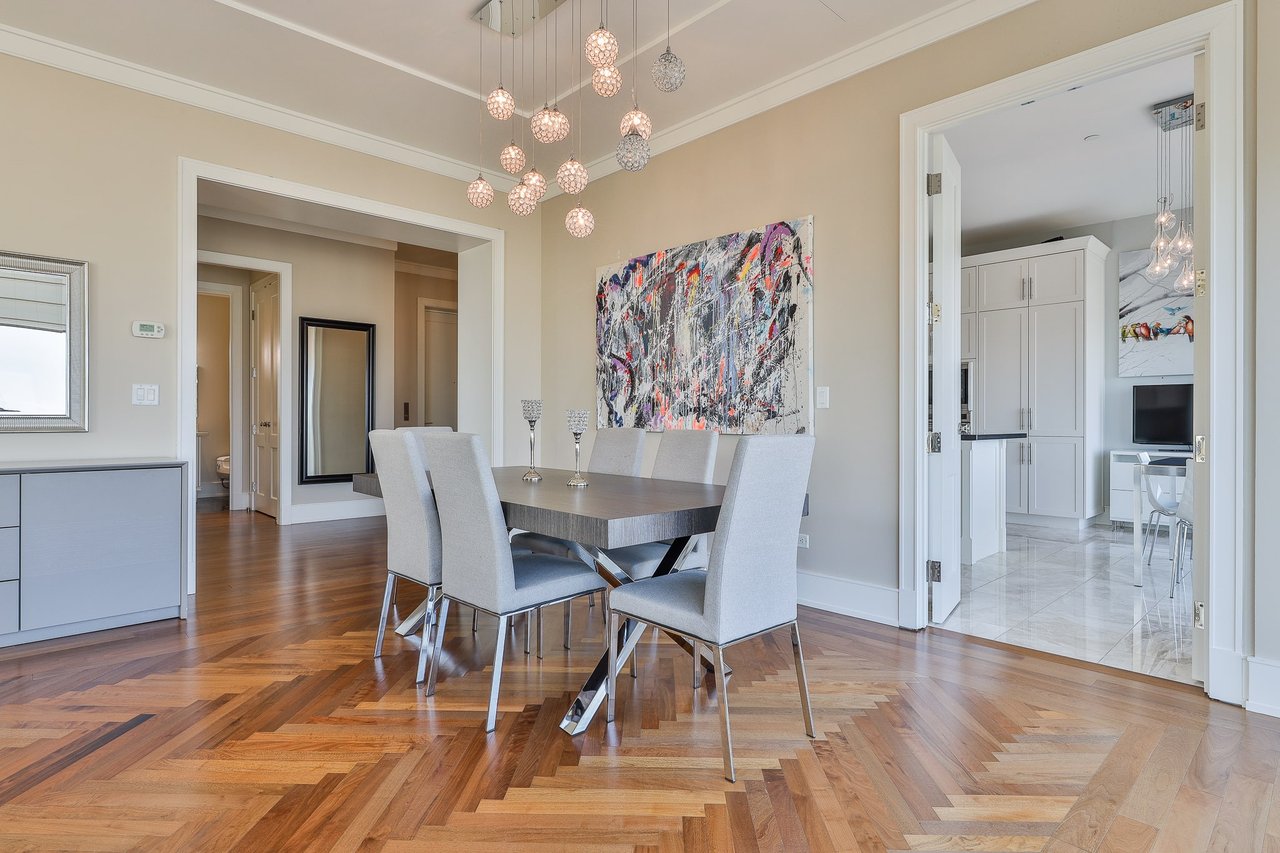 The Dining Room, open in design to the Living Room, features hardwood floor laid in a herringbone pattern, crown molding, chandelier, coffered ceiling, a pair of doors opening onto the Kitchen and wall-to-wall, floor-to-ceiling windows outfitted with custom blinds overlooking the North views.
