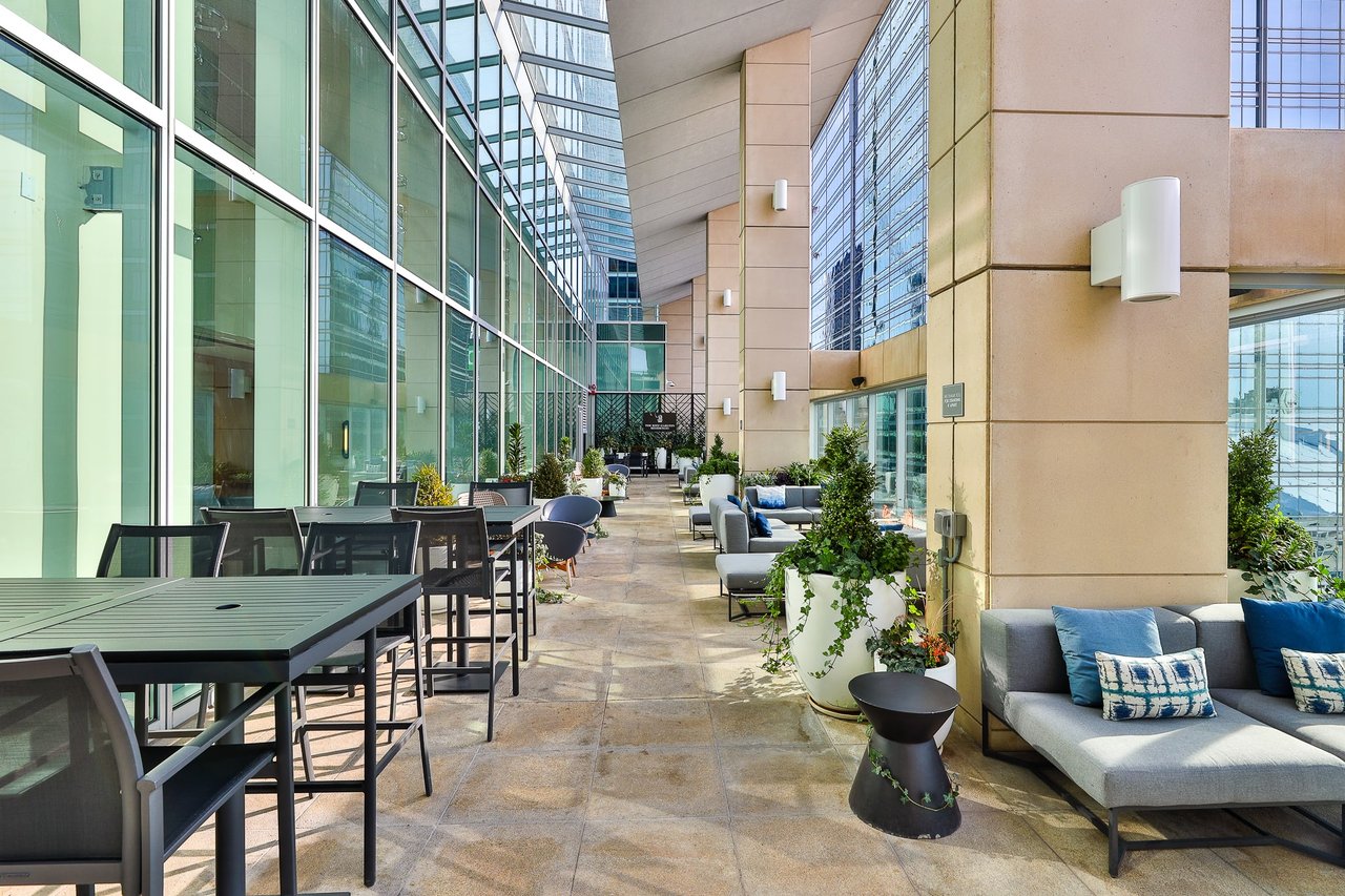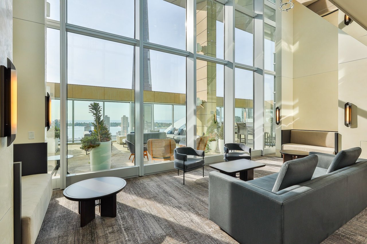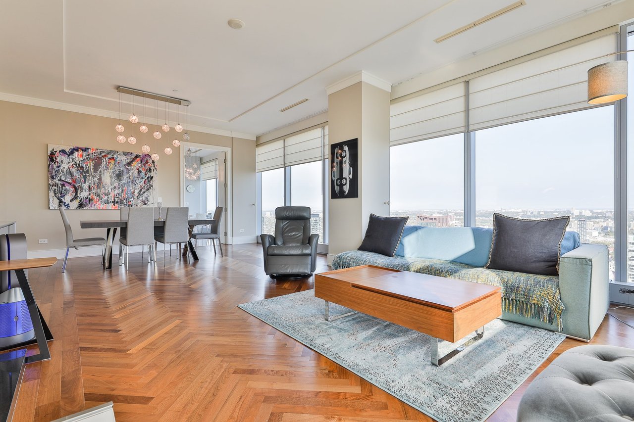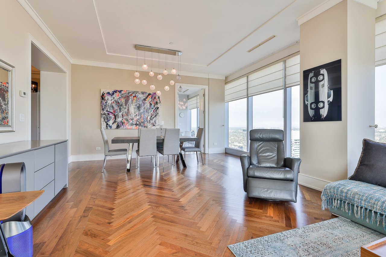 The open concept Living Room features hardwood floor laid in a herringbone pattern, crown molding, coffered ceiling and wall-to-wall, floor-to-ceiling windows outfitted with custom blinds overlooking the North and East views.