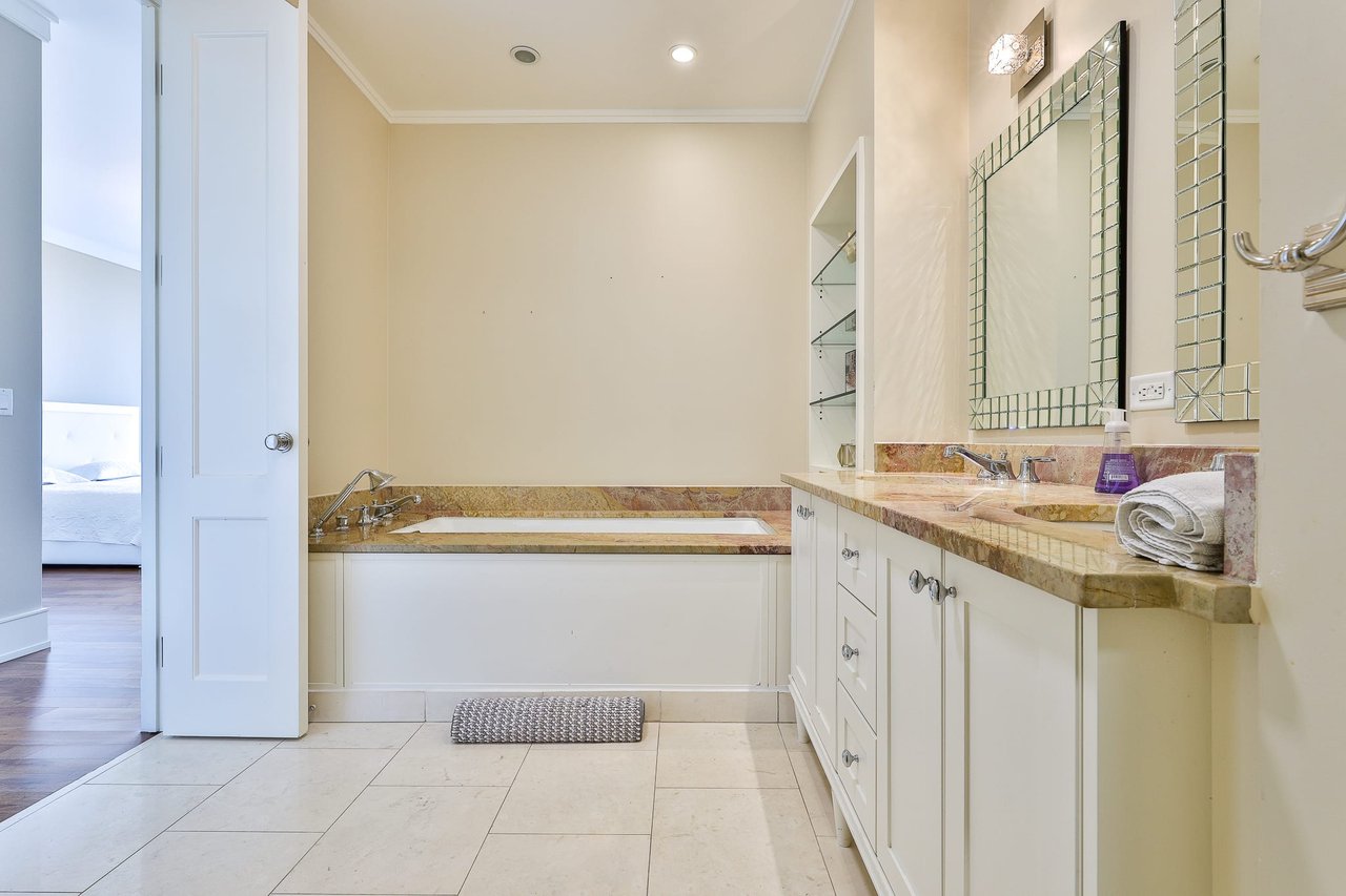 The luxurious 8-piece ensuite bath, entered through a pair of double doors, features heated limestone floor, glass shelving, crown molding, pot lights, a light fixture, a deep soaker jet tub with a marble surround, mirrors, light sconce and a custom vanity with a marble countertop and “His” and “Hers” under mount sinks.