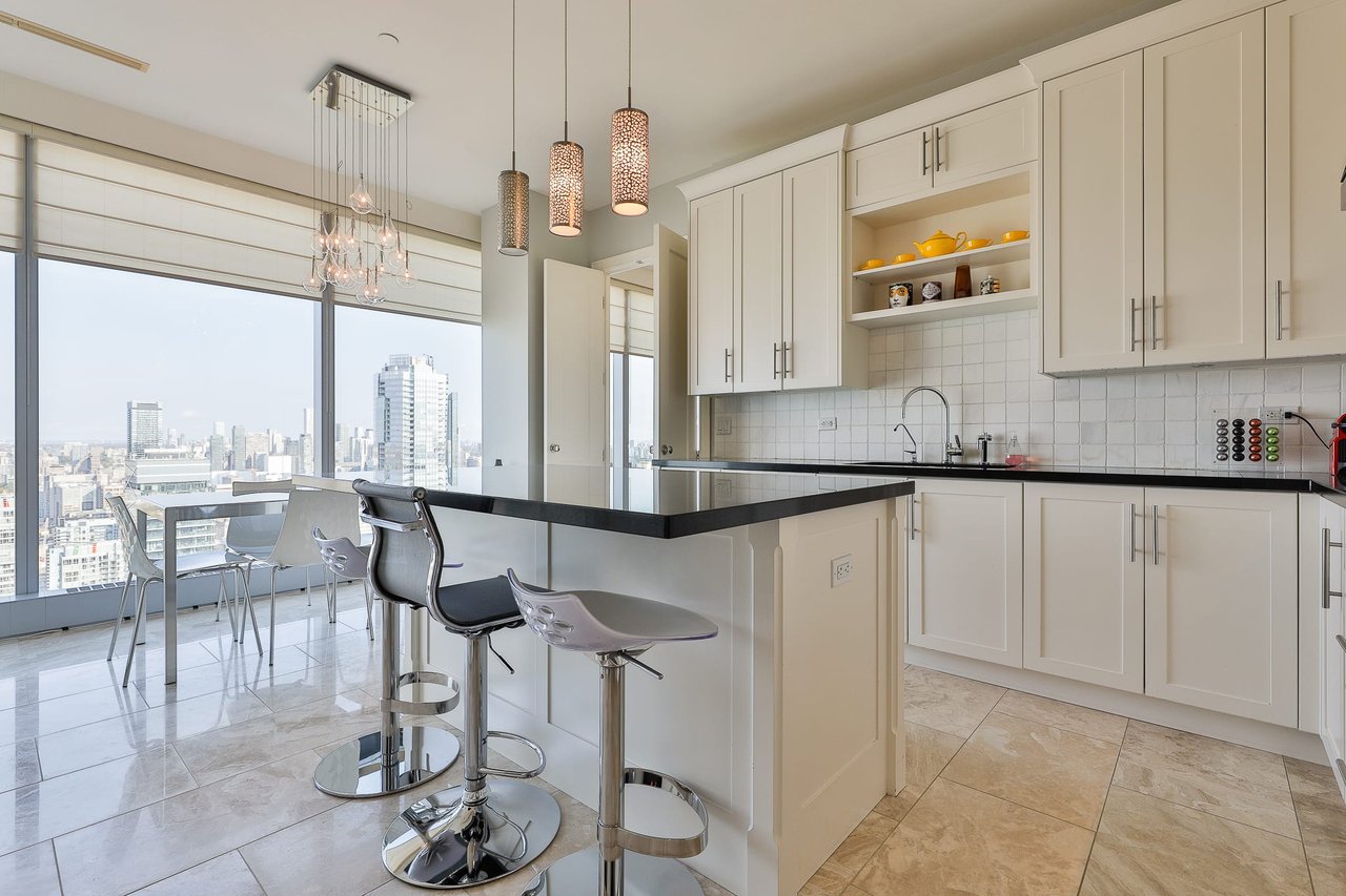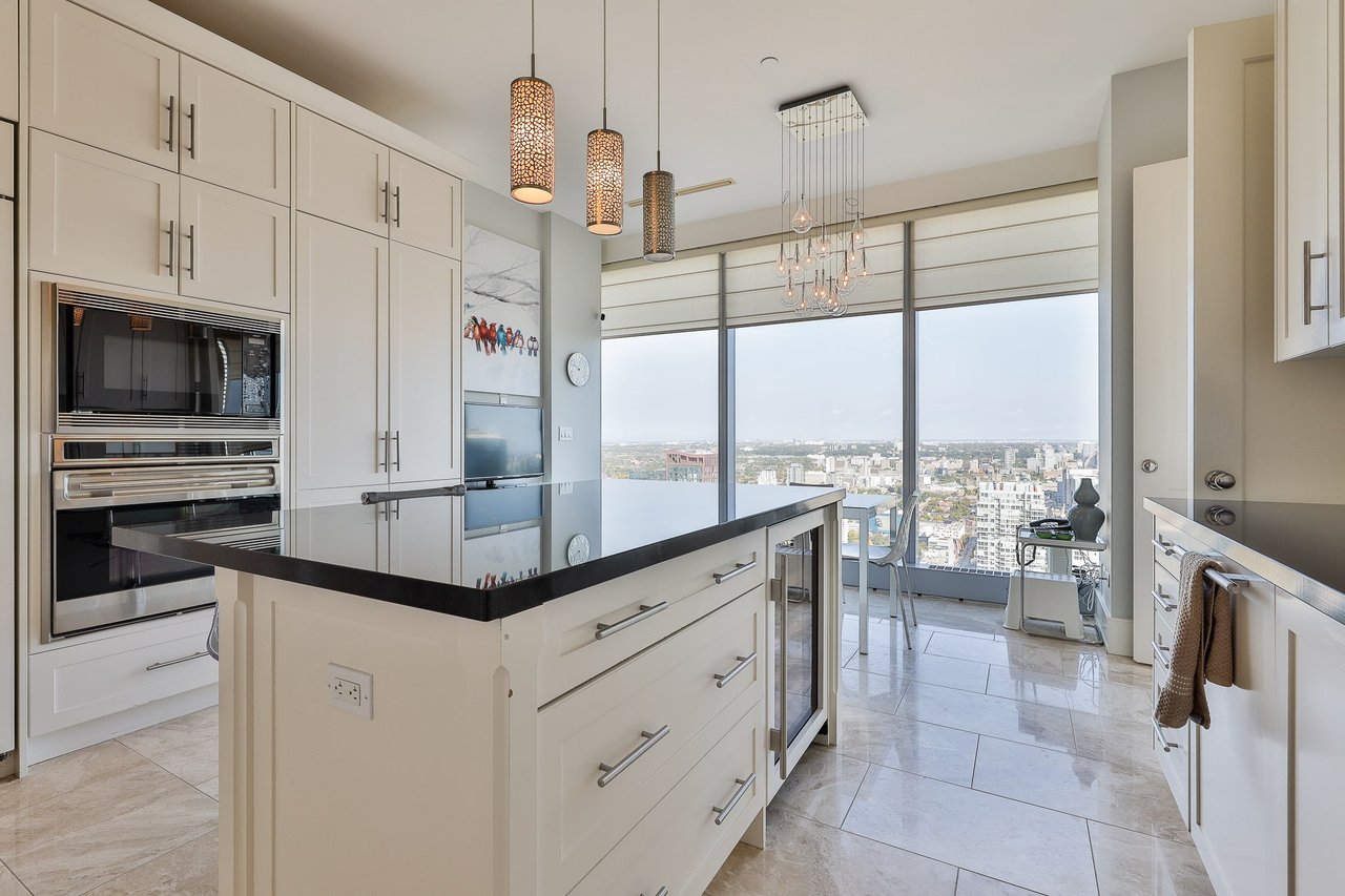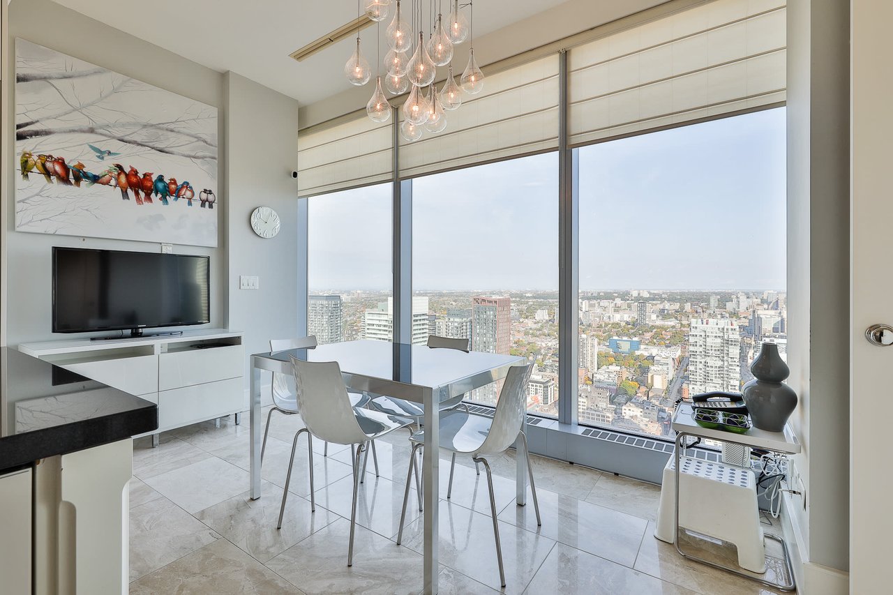The Breakfast Area, open in design to the Kitchen, features limestone floor, wall-to-wall, floor-to-ceiling windows outfitted with custom blinds overlooking the North views and a light fixture.