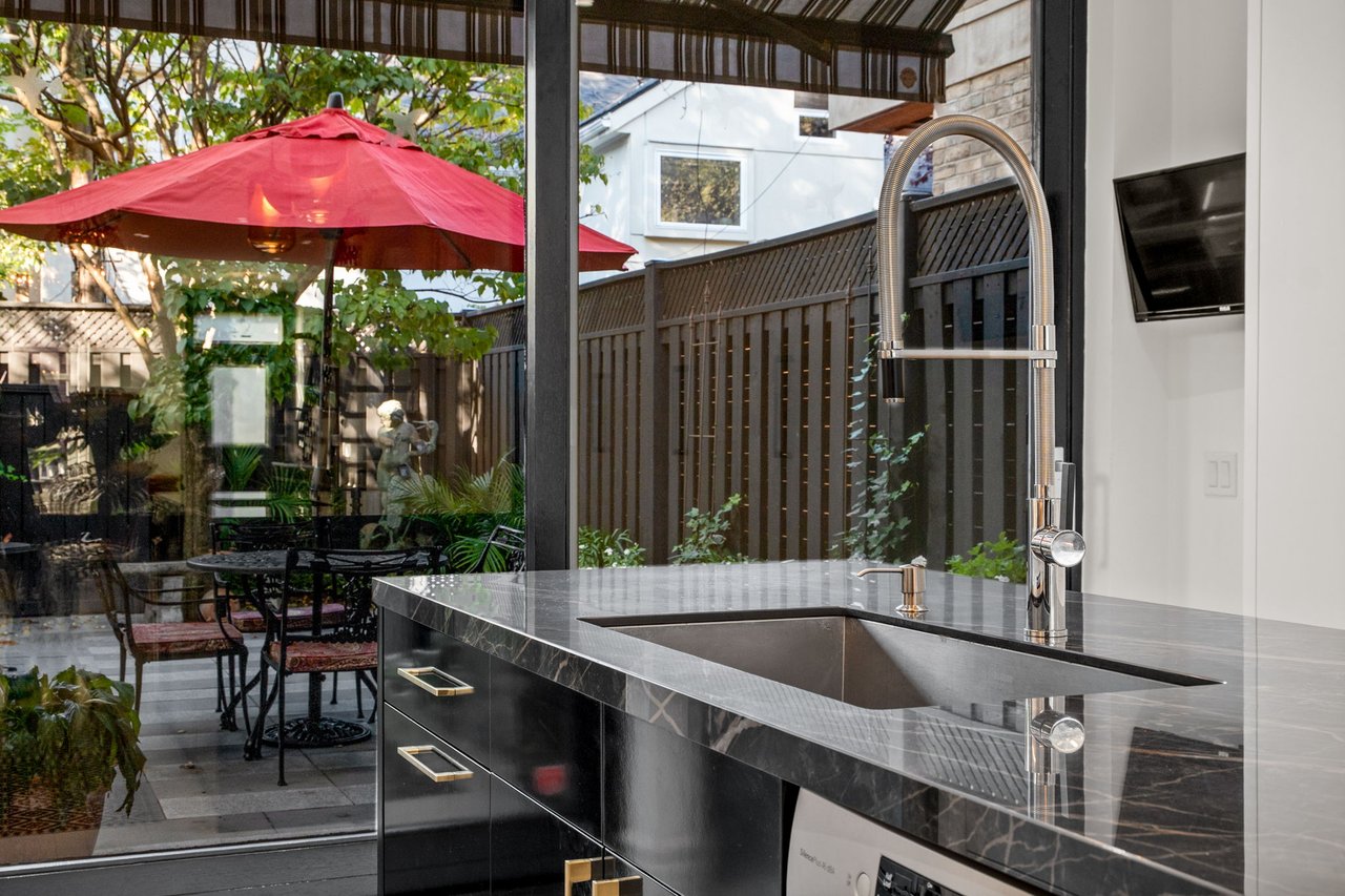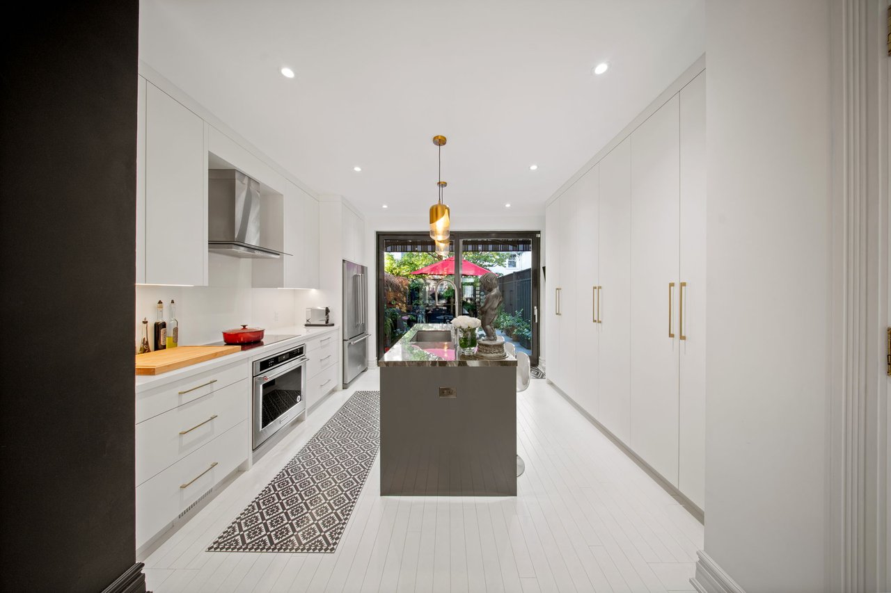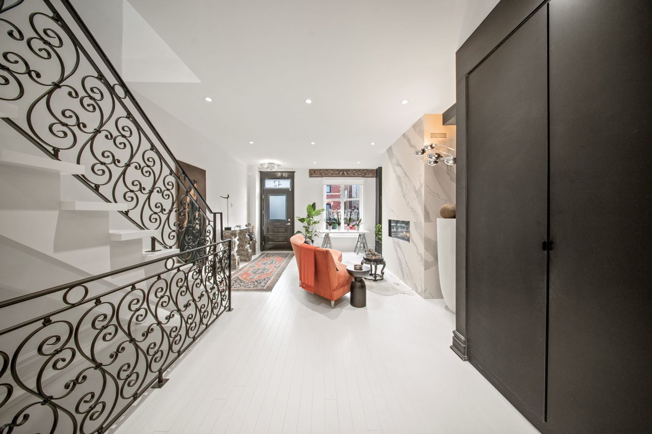 Welcome to 42 Berryman Street, a rare designer's residence built in 2003 and fully renovated in 2020, tucked away in the heart of Yorkville right off of Hazelton Ave. This fully customized home combines timeless Victorian architecture with contemporary European elegance, offering an unparalleled lifestyle for the most discerning buyer. The main floor is defined by a dramatic open-concept layout with soaring ceilings, a marble-slab feature wall with linear fireplace, and bespoke wrought-iron staircase detailing. Natural light pours through expansive windows and skylights, illuminating every refined finish. At the heart of the home, the chef's kitchen showcases full-height custom cabinetry, premium appliances, and a bold quartz waterfall island. Sleek pendant lighting and direct walkout access to a private courtyard make this space ideal for both everyday living and sophisticated entertaining. Upstairs, the vaulted primary suite offers a serene retreat with custom built-ins and a spa-inspired ensuite featuring a floating double vanity, dramatic marble shower. Additional bedrooms provide comfort and versatility, complemented by elegant baths finished with curated stone and designer fixtures. The fully finished lower level extends the living space with a flexible family room, private office, or gym complete with custom built-ins and a linear fireplace. Outdoors, a landscaped, maintenance-free courtyard offers a true urban sanctuary with granite tiling, privacy fencing, gas BBQ station-perfect for alfresco gatherings. Every detail at 42 Berryman has been carefully curated to deliver a residence of exceptional style, comfort, and sophistication.